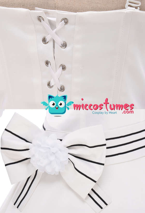 The costume includes dress, sleeves*2, hat, neck accessory, ribbon belt, stockings, thigh ribbon*2, petticoat. It is made of spandex, satin, lining.