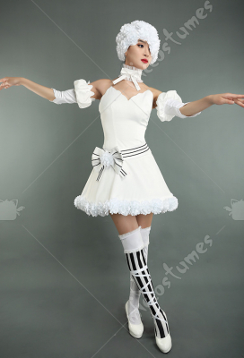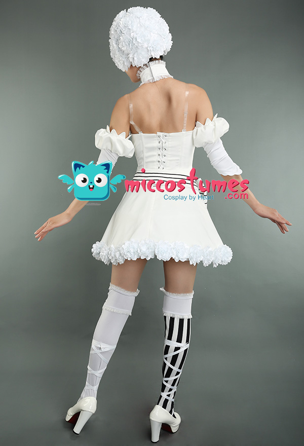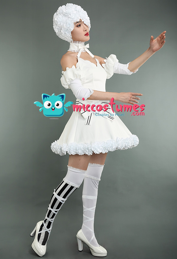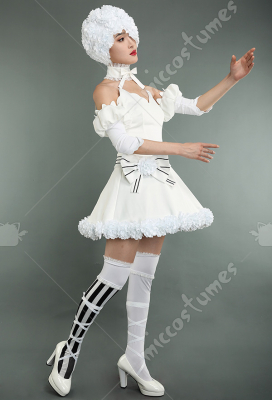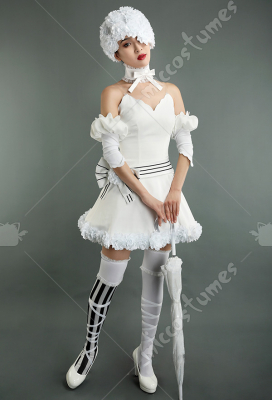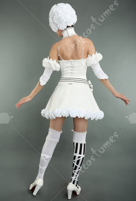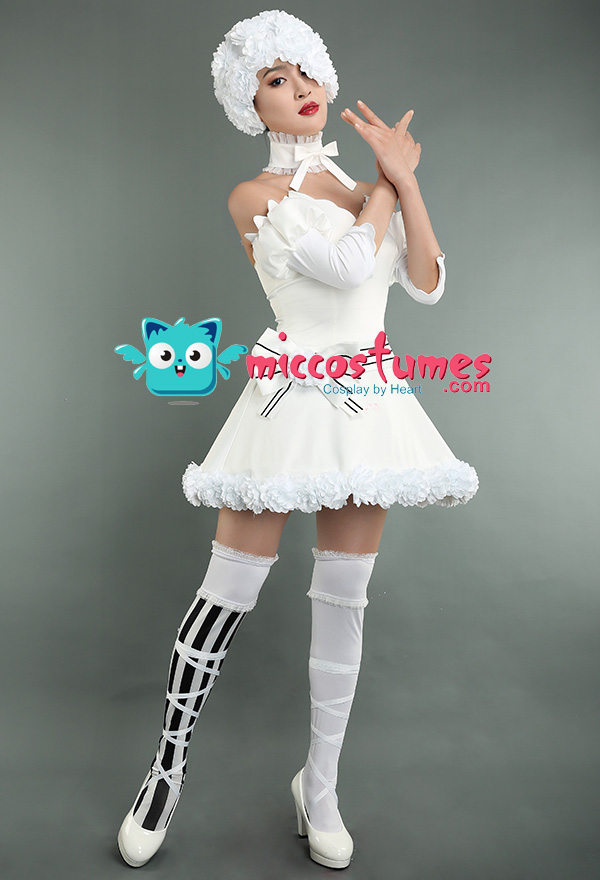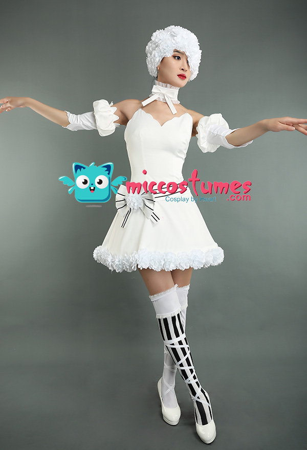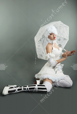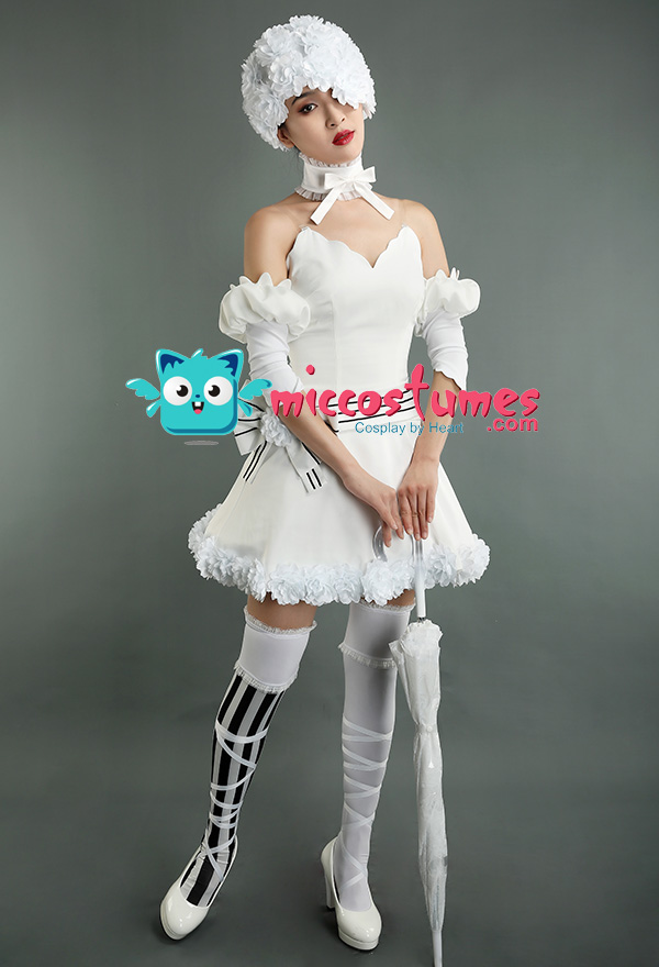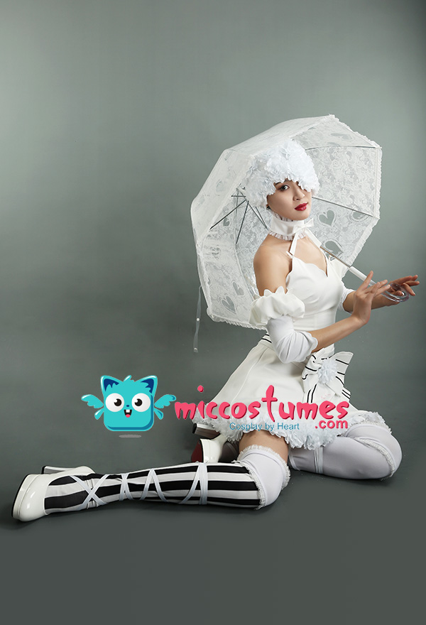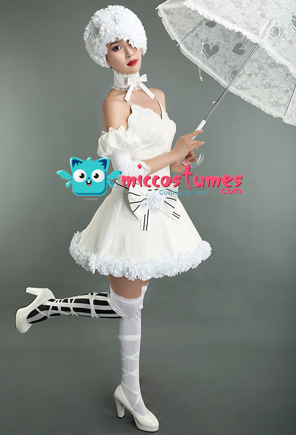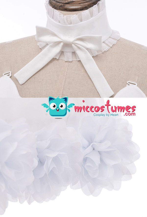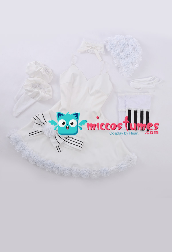 The costume includes dress, sleeves*2, hat, neck accessory, ribbon belt, stockings, thigh ribbon*2, petticoat. It is made of spandex, satin, lining.