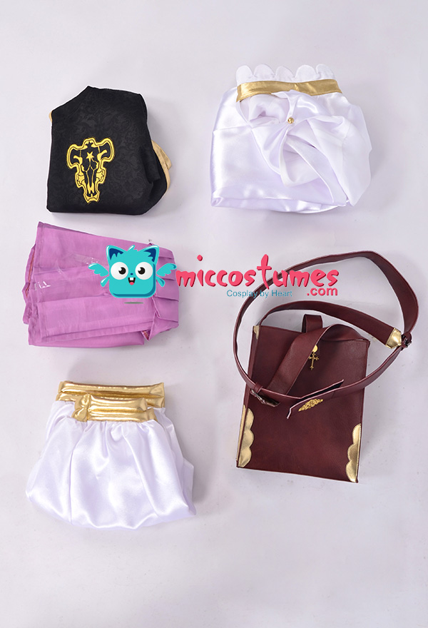 The costume includes inner dress, dress, cape, belt*1, bag*1, leg warmer*2. It is made of spandex, PU leather, satin, lining, cotton, jacquard fabric, EVA.
