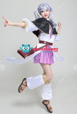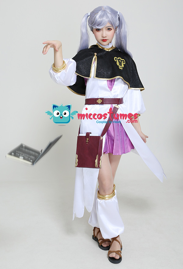 The costume includes inner dress, dress, cape, belt*1, bag*1, leg warmer*2. It is made of spandex, PU leather, satin, lining, cotton, jacquard fabric, EVA.