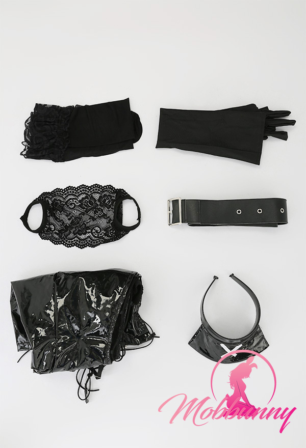 Costume Includes: dress, headwear, belt, face mask, gloves, stockings, hose clamp. Material: vernis. Design Details: The whole skirt is vernis design, the sides of the tape can be glued together with Velcro so that can adjust the position of the tape, cords on either side of a skirt can also be adjusted. The strap on the chest is affixed to the clothes with velcro and can be removed.