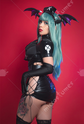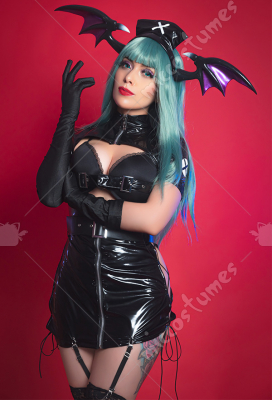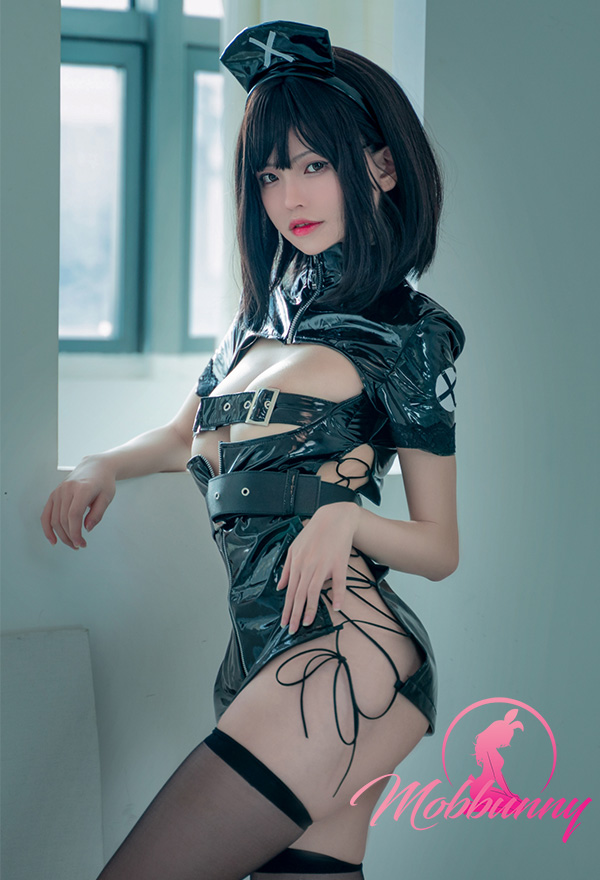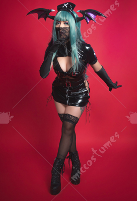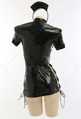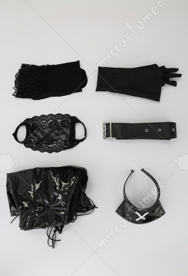 Costume Includes: dress, headwear, belt, face mask, gloves, stockings, hose clamp. Material: vernis. Design Details: The whole skirt is vernis design, the sides of the tape can be glued together with Velcro so that can adjust the position of the tape, cords on either side of a skirt can also be adjusted. The strap on the chest is affixed to the clothes with velcro and can be removed.