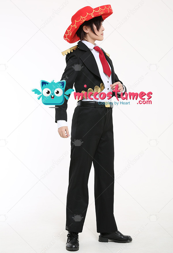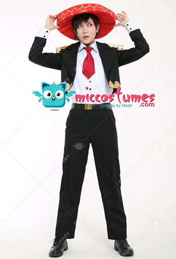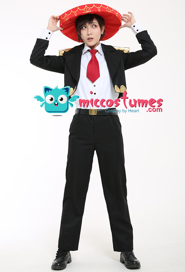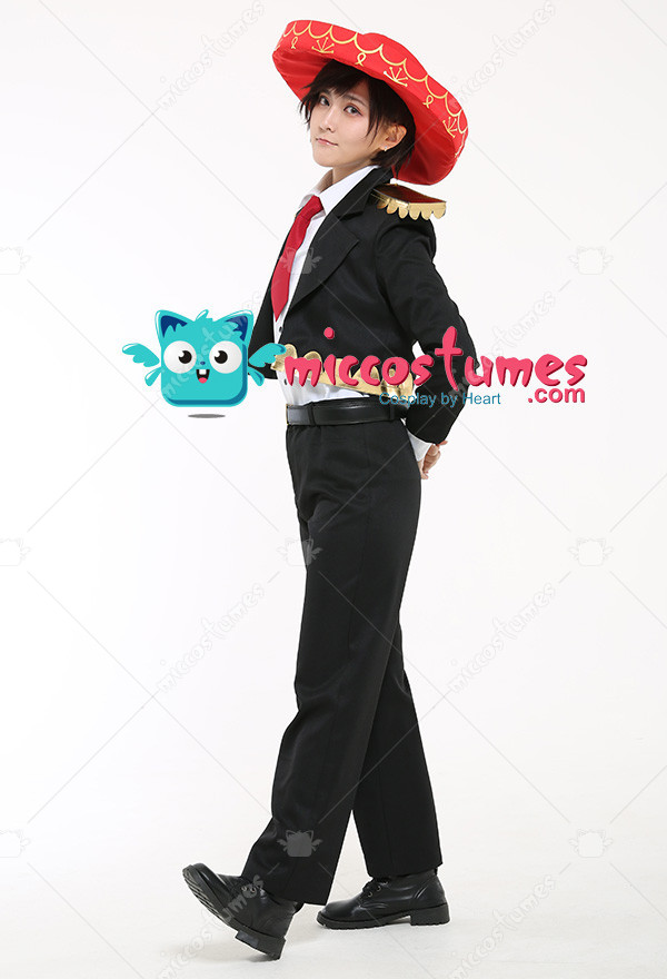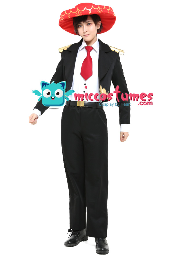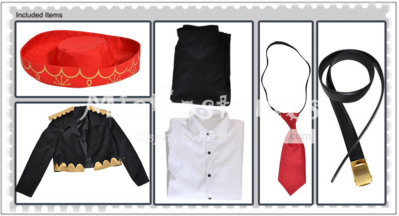 This costume includes the coat, pants, shirt, hat, belt, tie. It is made of uniform cloth, PU leather, shirt fabric.