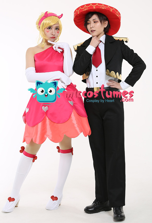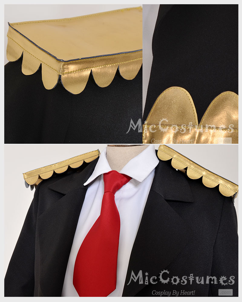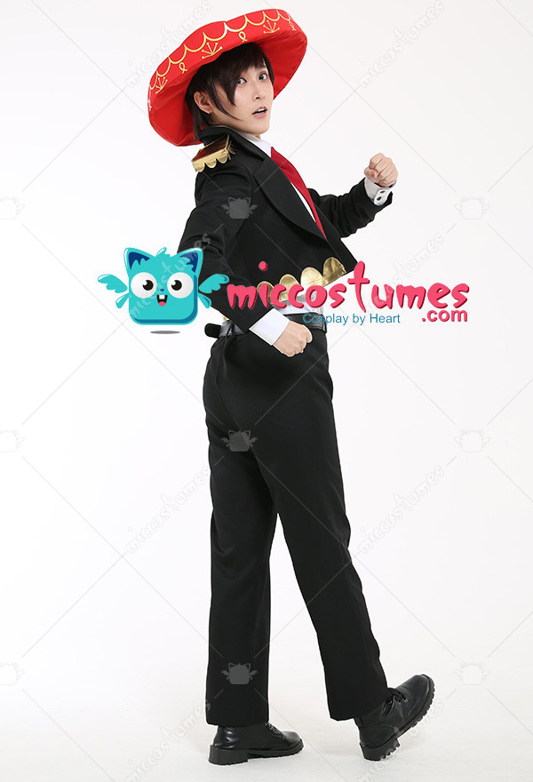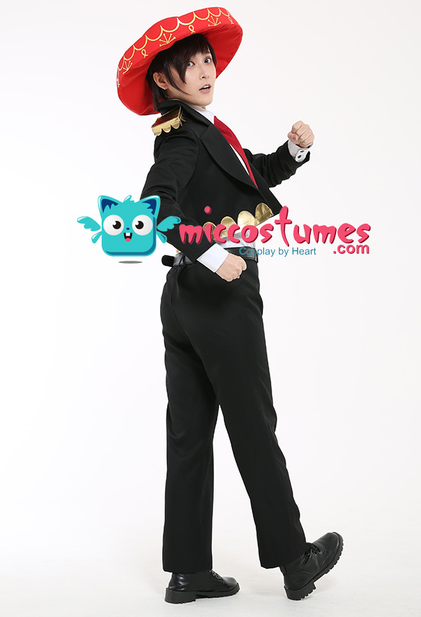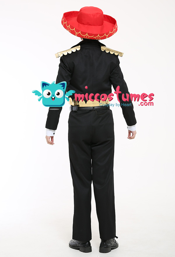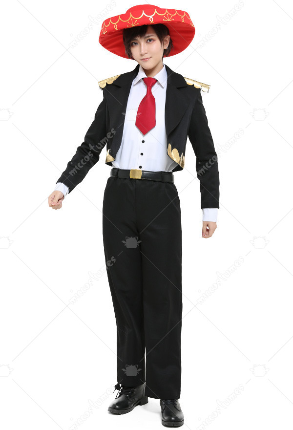 This costume includes the coat, pants, shirt, hat, belt, tie. It is made of uniform cloth, PU leather, shirt fabric.