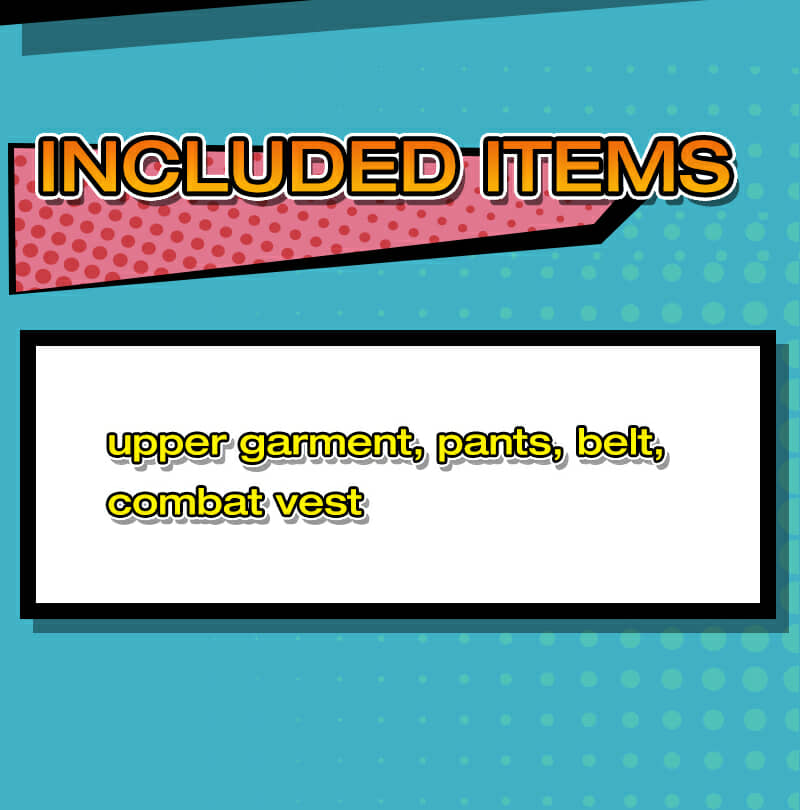 Includes: Upper garment, pants, belt, combat vest Material: Hoodie fabric Nice Details: The pants with elastic waistband are easy to put on or take off.