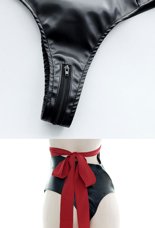 Costume Includes: bodysuit, bowknot sailor collar*1. Material: PU leather. Design Details: Backless design of the costume aims to show the beautiful back curves. The design of the sailor collar is cute and unique. Notice:Due to the character of PU leather, please do not place it together with light-color costumes.