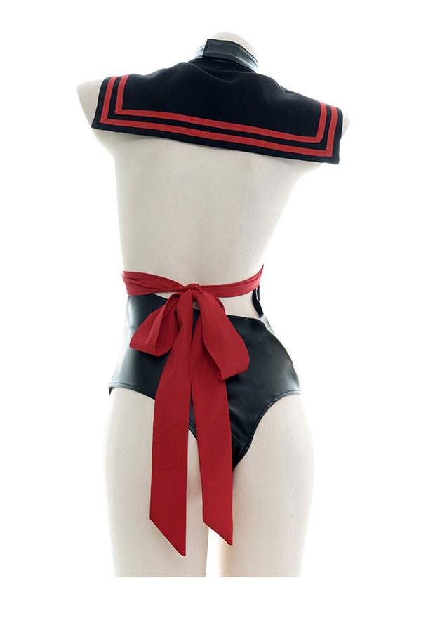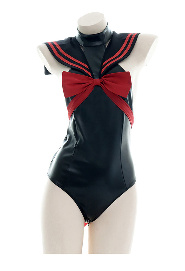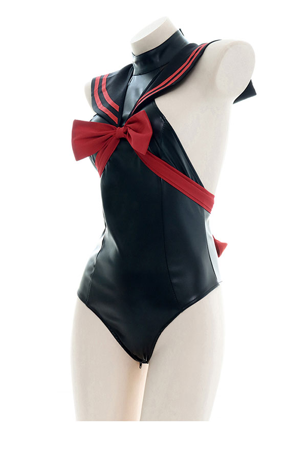 Costume Includes: bodysuit, bowknot sailor collar*1. Material: PU leather. Design Details: Backless design of the costume aims to show the beautiful back curves. The design of the sailor collar is cute and unique. Notice:Due to the character of PU leather, please do not place it together with light-color costumes.