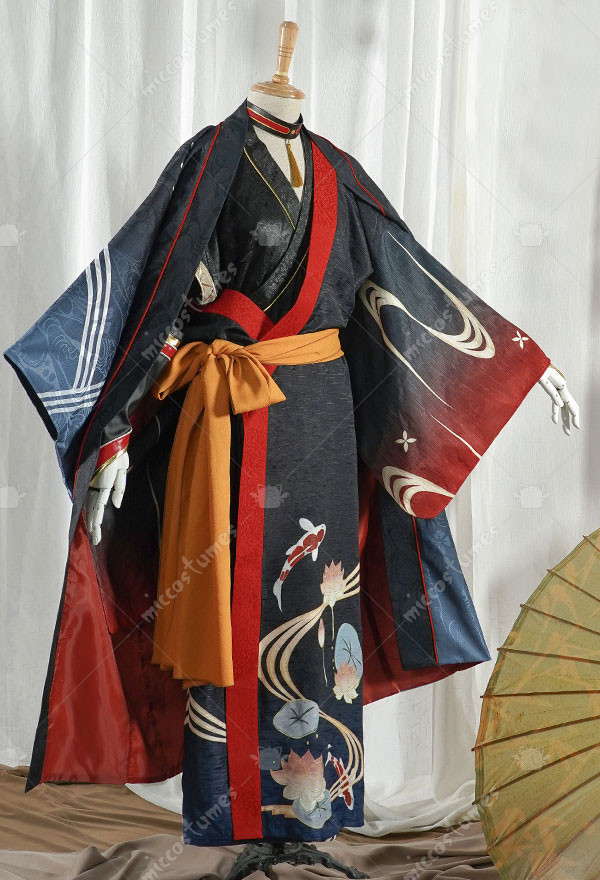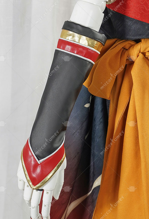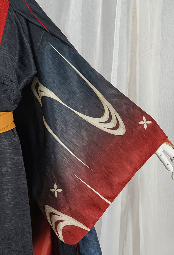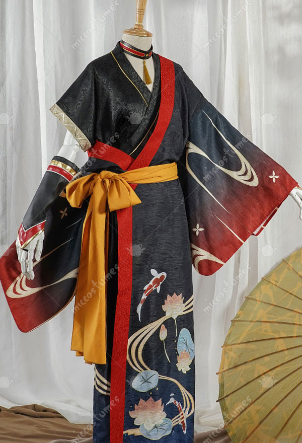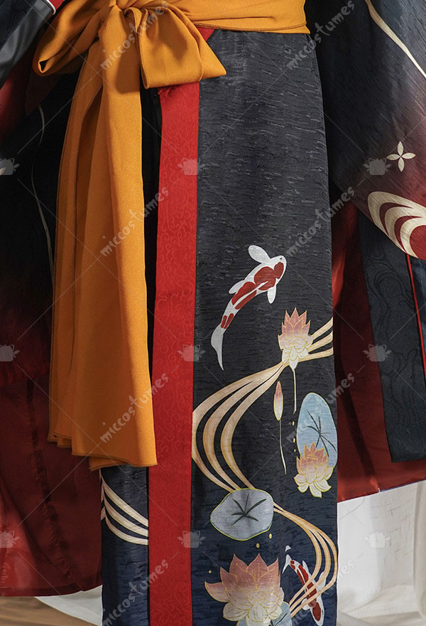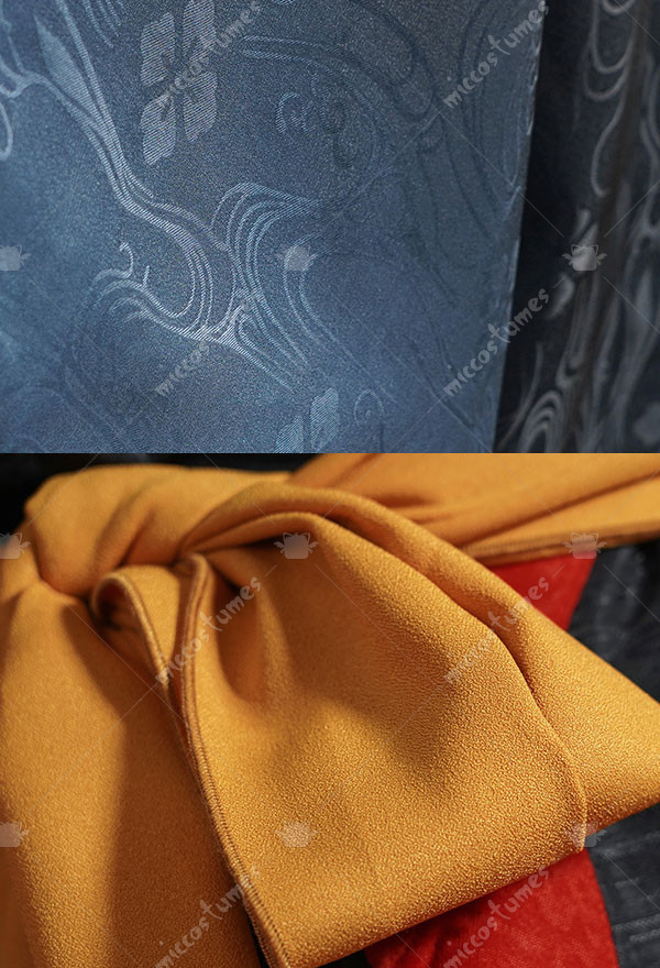 The costume includes coat, base kimono, middle kimono, sleeves*2, choker, waistband. It is made of printing fabric, jacquard fabric, PU leather.