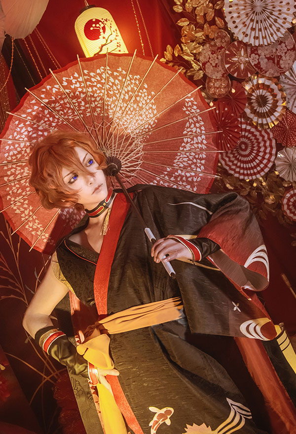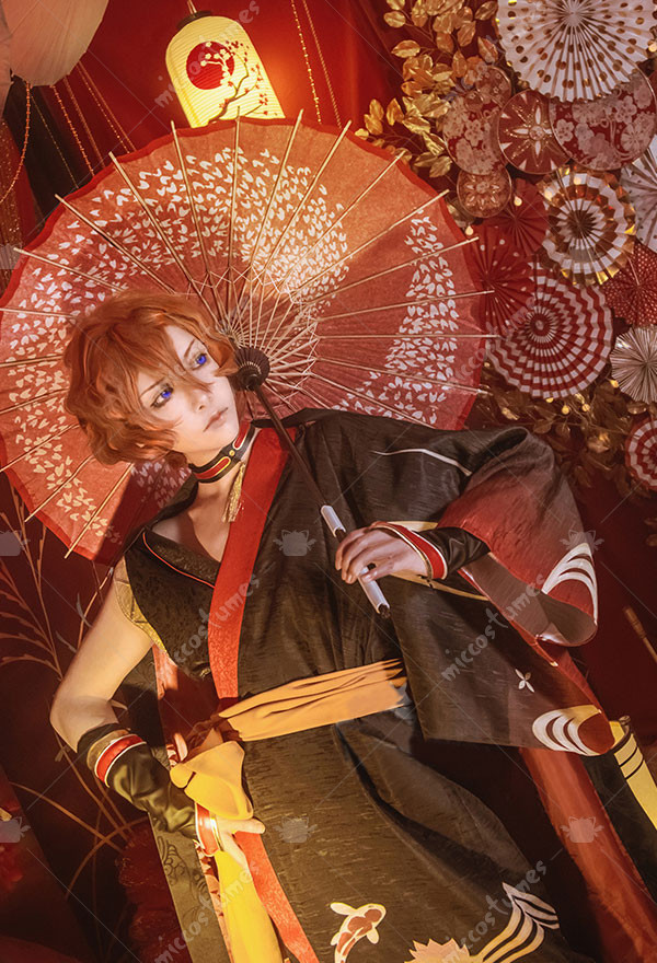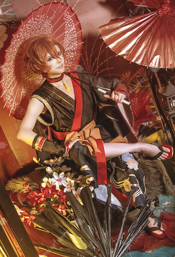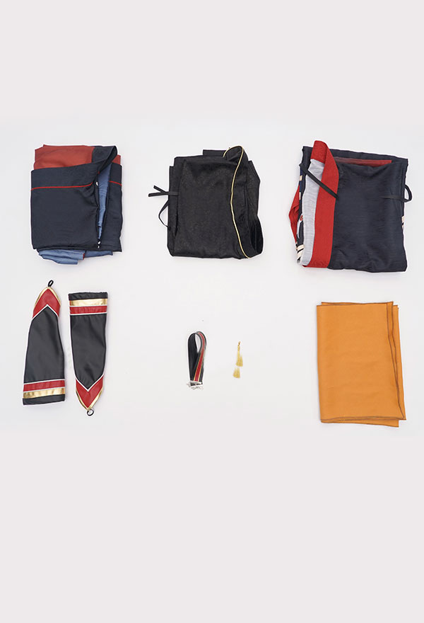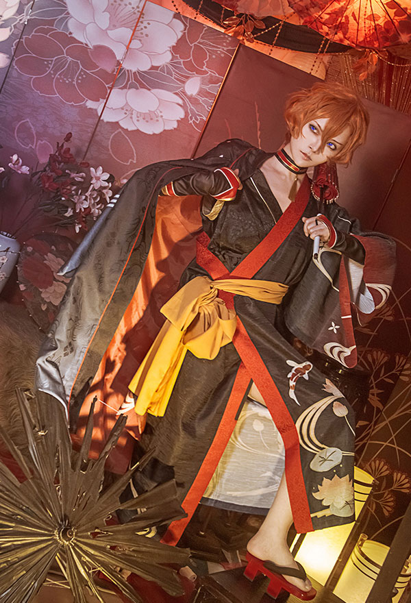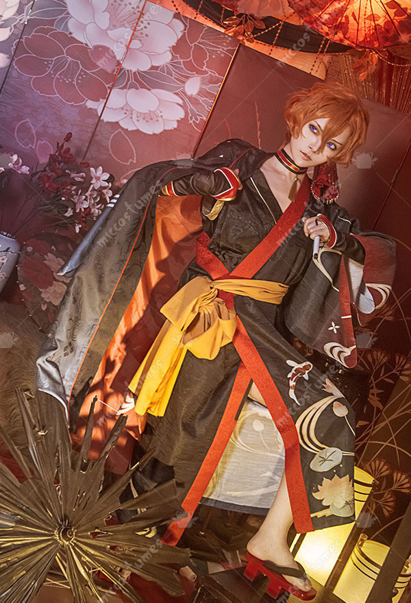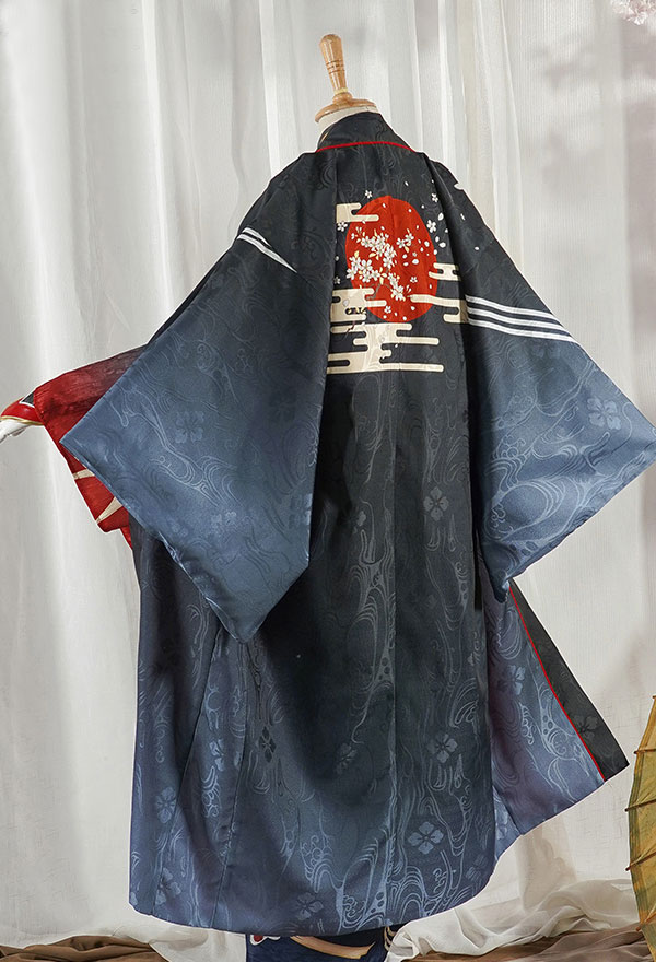 The costume includes coat, base kimono, middle kimono, sleeves*2, choker, waistband. It is made of printing fabric, jacquard fabric, PU leather.