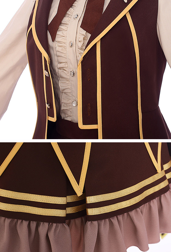 The costume includes shirt, skirt, tuxedo coat, collar bow and head accessory. It is made of high imitation fabric.