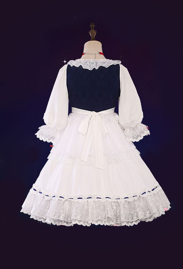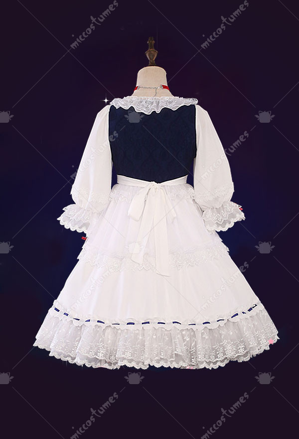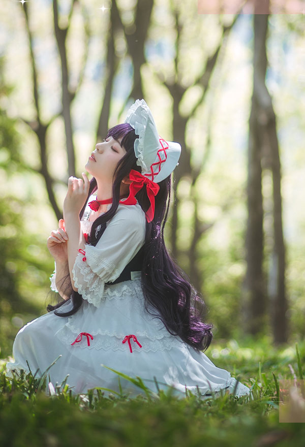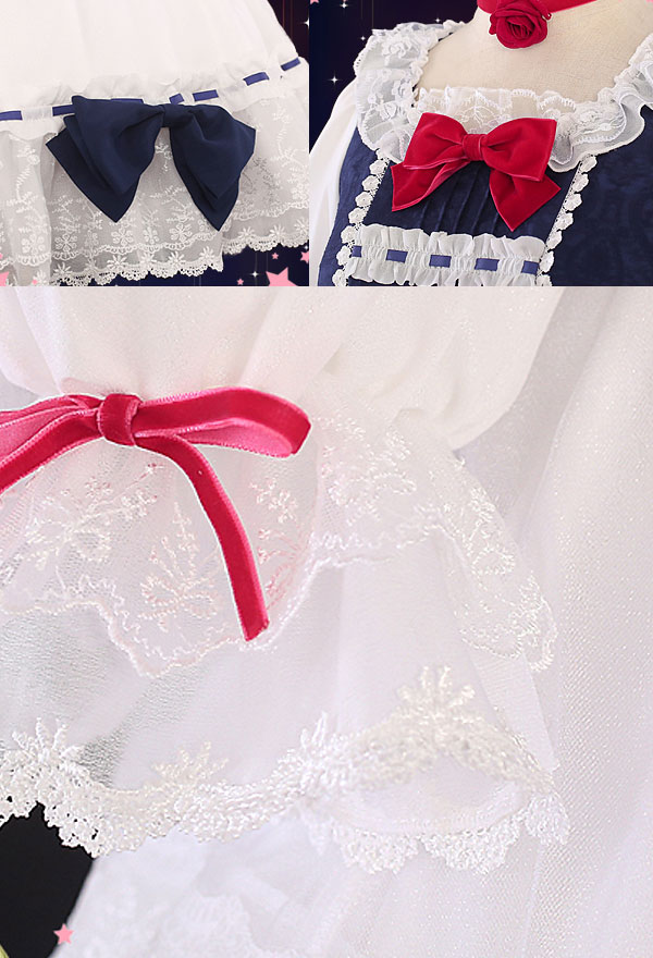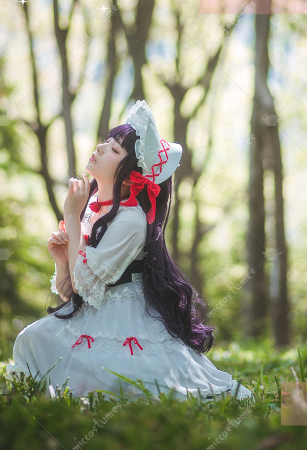 The costume includes dress, bonnet, choker, leg accessory*2, sock*1, stocking*1. It is made of chiffon.