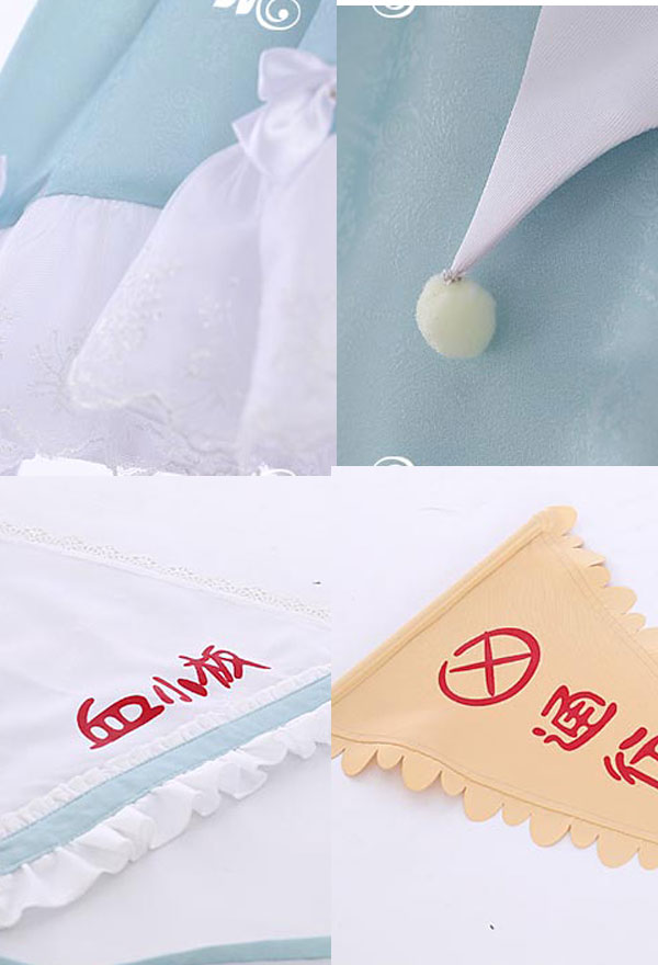 The costume includes dress, waist bowknot, flag, headdress. It is made of embroidery lace fabric, jacquard fabric.