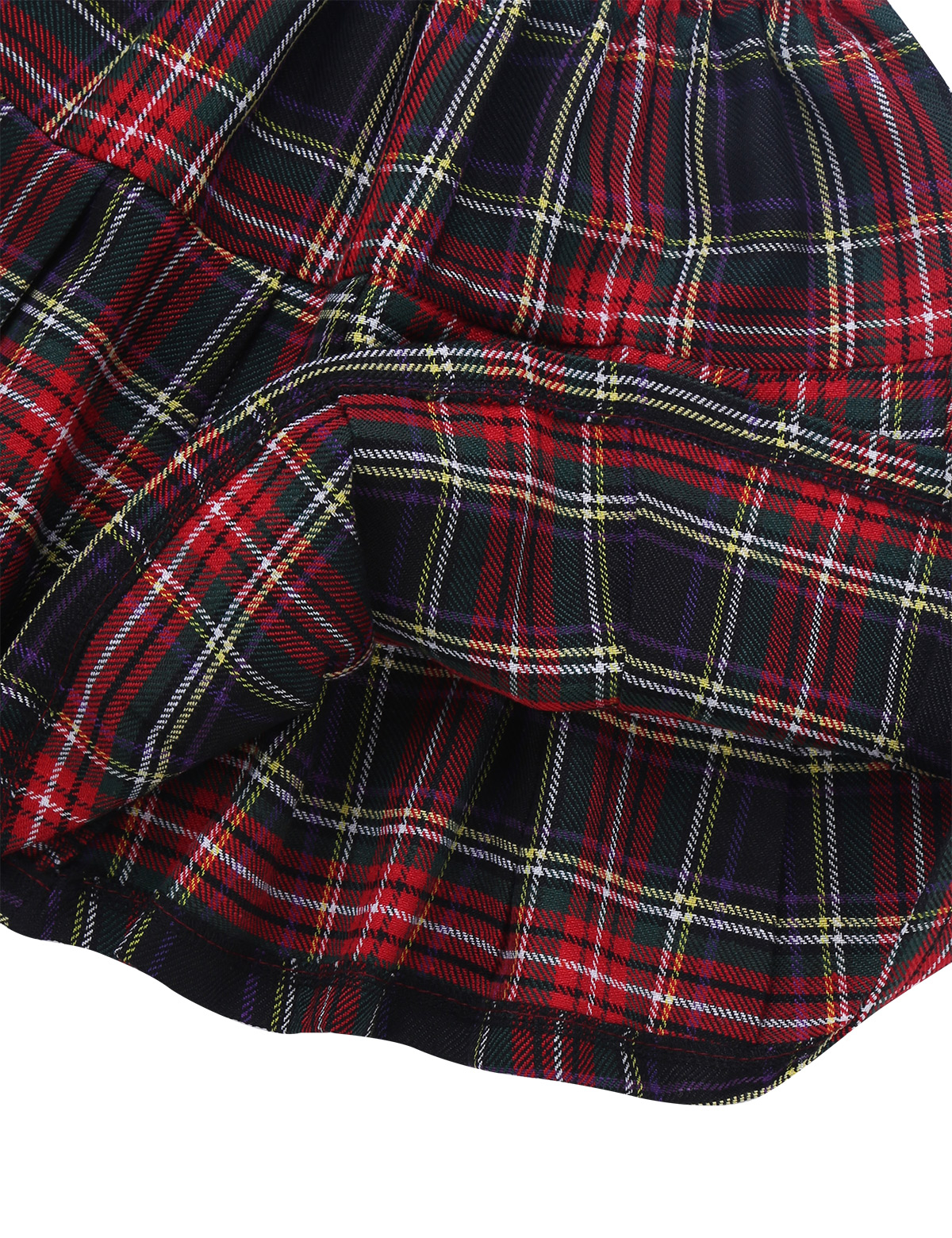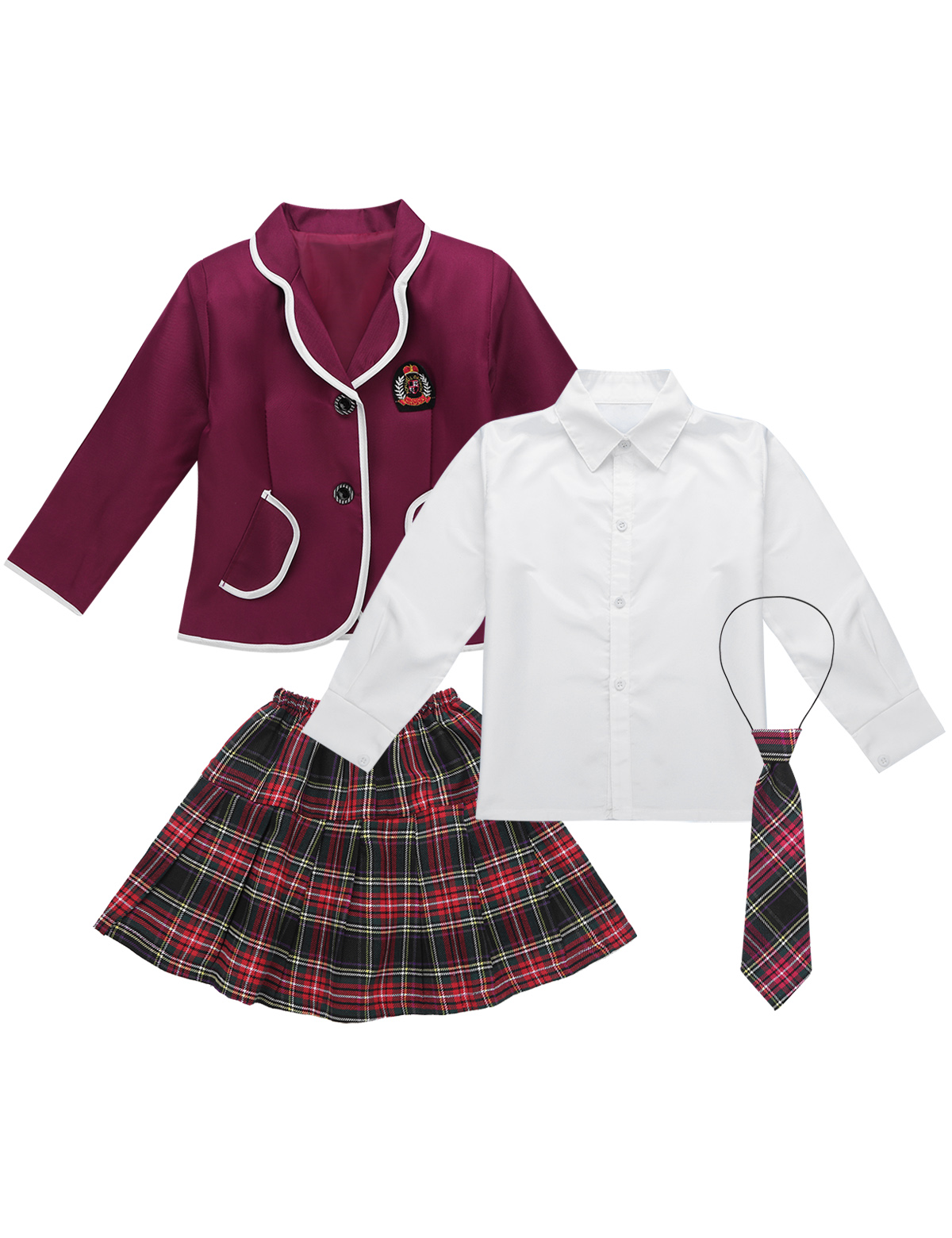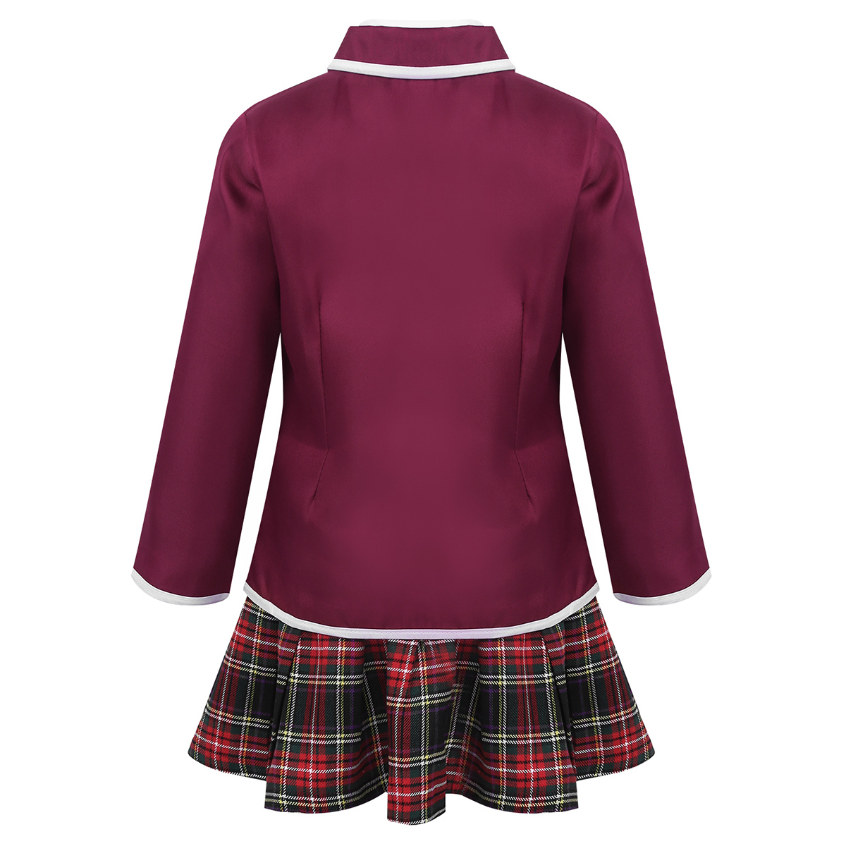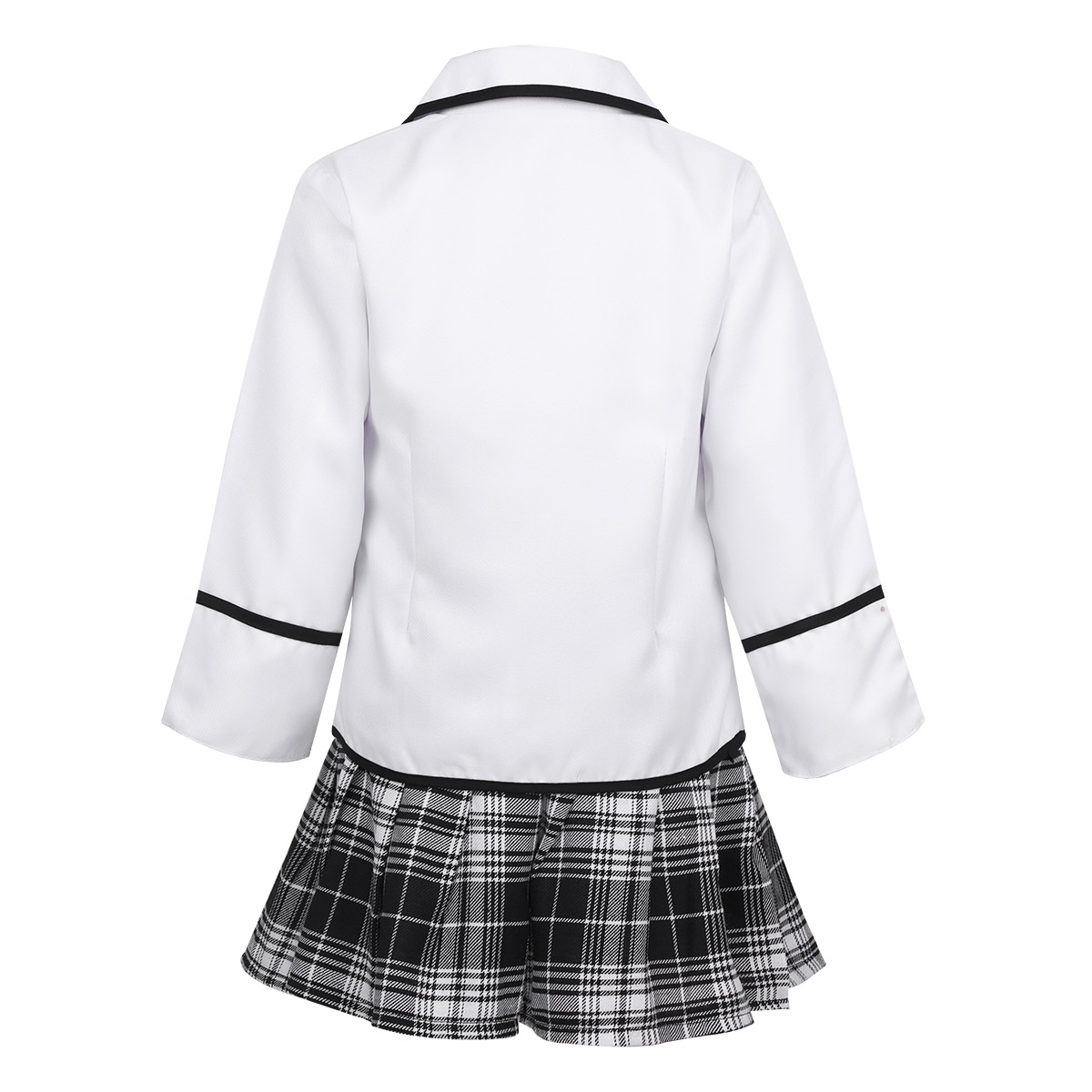 White turn-down collar shirt, buttons closure at front and cuffs. Matching a tie, elastic waistband pleated skirt with plaid pattern.