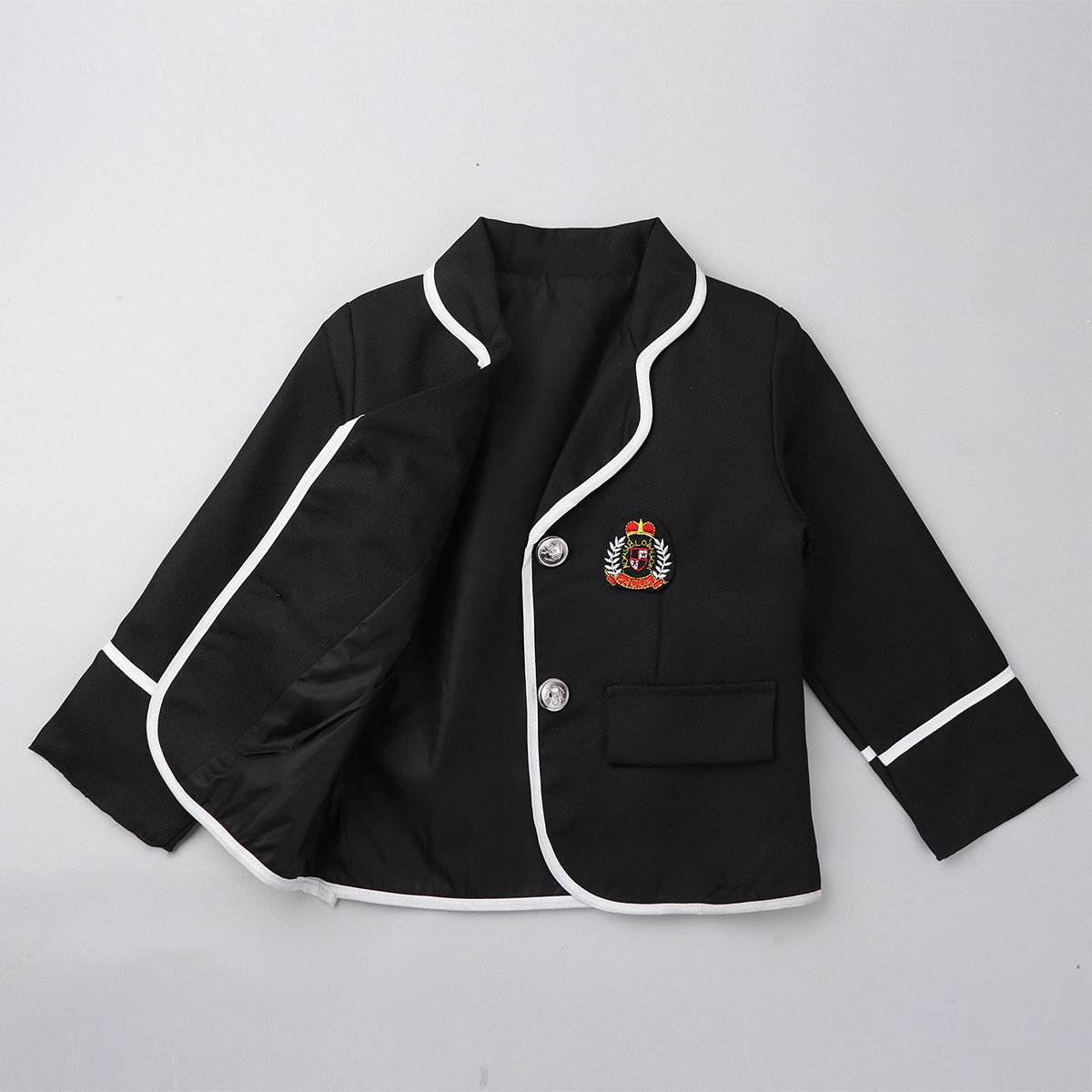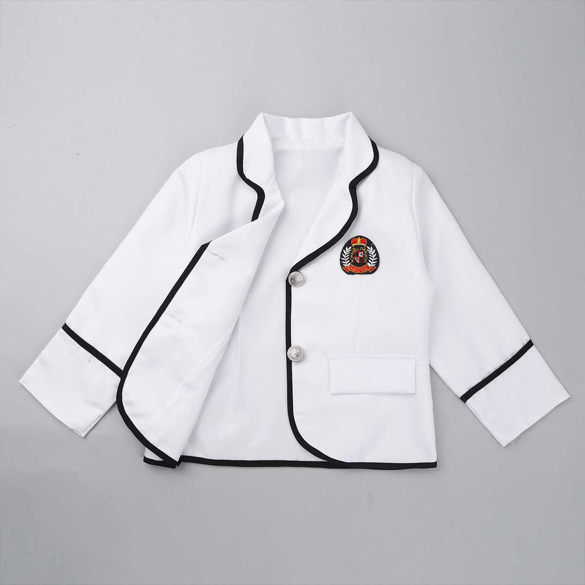 Long sleeve coat with wide lapel design, chest with a stitched badge. 2 buttons and 2 faux pockets at front.