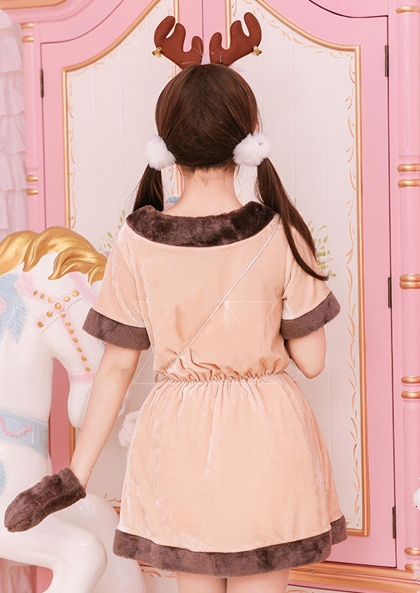 The costume includes dress, belt, gloves, headband. It is made of flannel, polyester fibre.