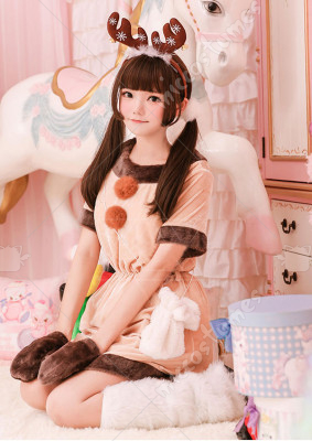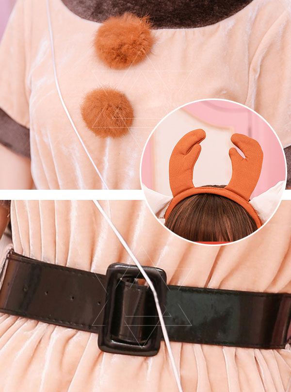 The costume includes dress, belt, gloves, headband. It is made of flannel, polyester fibre.