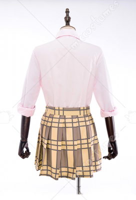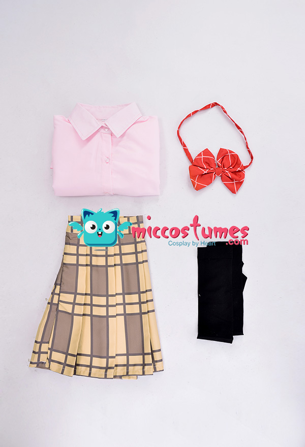 This costume includes bow tie, shirt, skirt, stockings. It is made of uniform cloth, polyester.