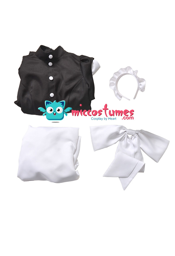 The costume includes dress, apron, headwear, bow. It is made of uniform cloth, spandex.