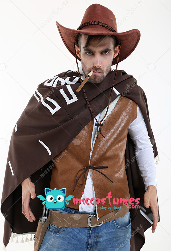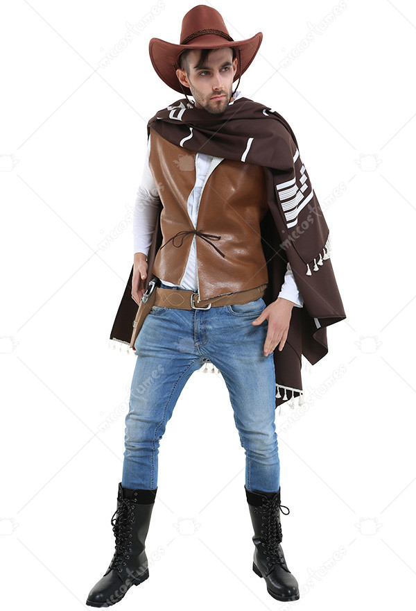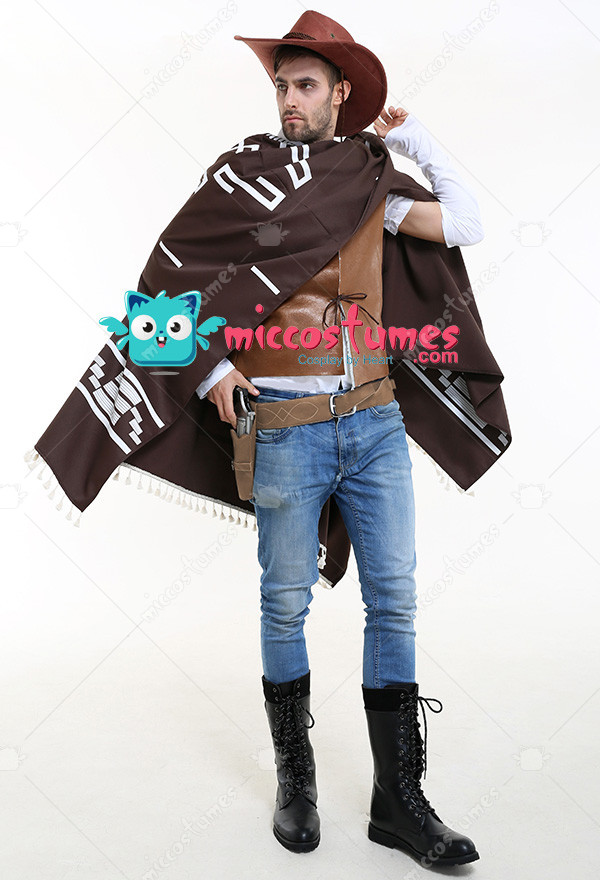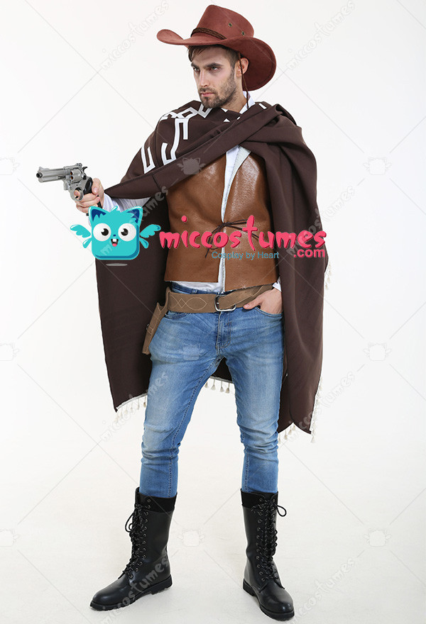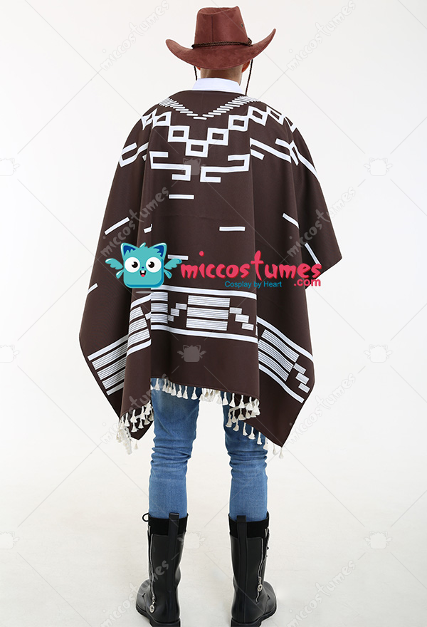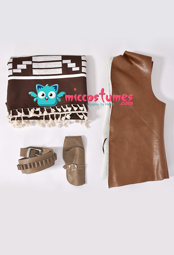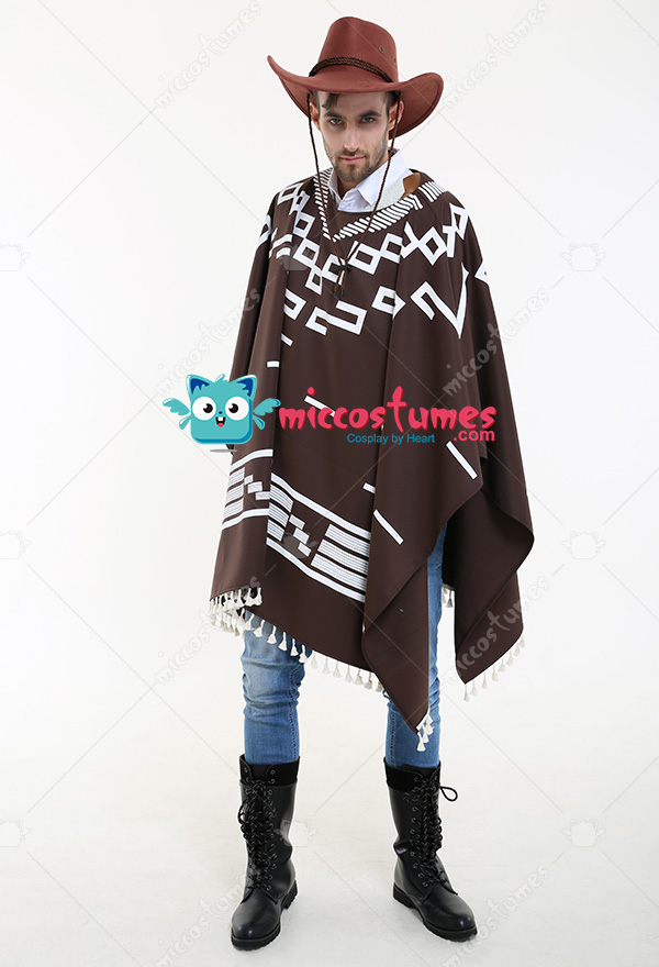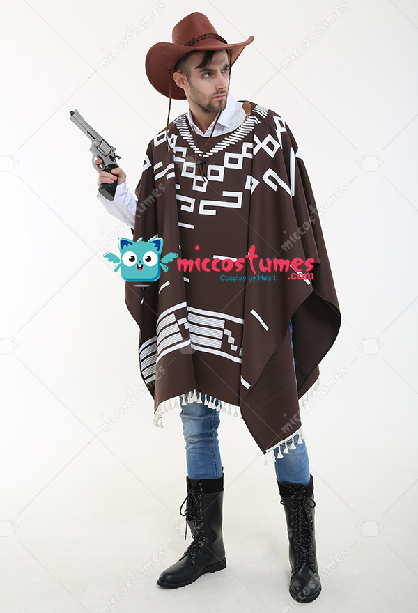 The costume includes poncho, vest, holster*1. It is made of uniform cloth, PU leather, imitated fur, EVA.