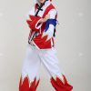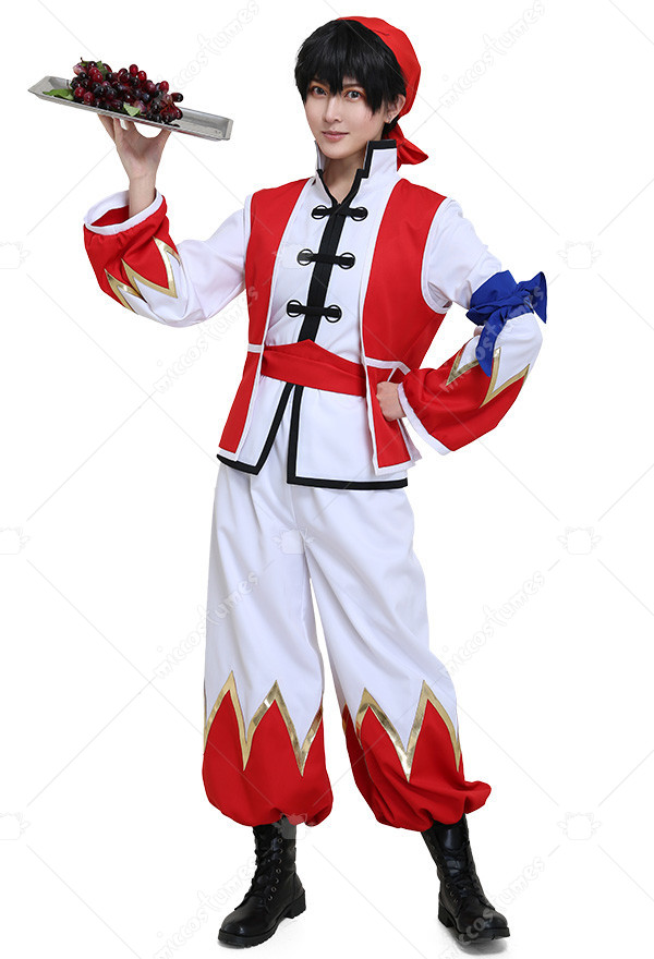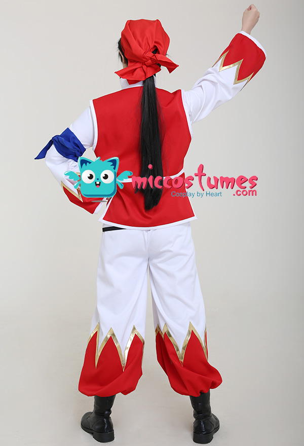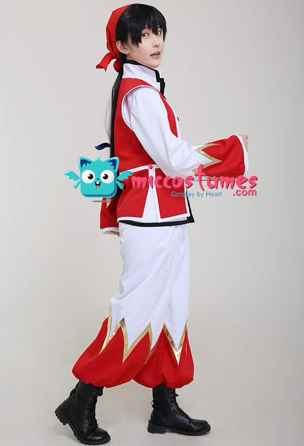 The costume includes top, vest, pants, belt, headband, sleeve accessory*1. It is made of spandex, PU leather, polyester.