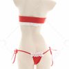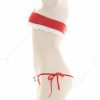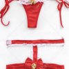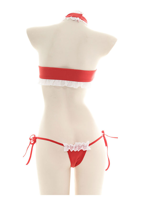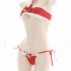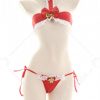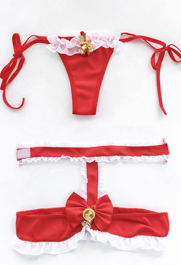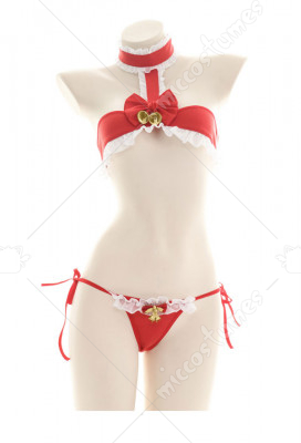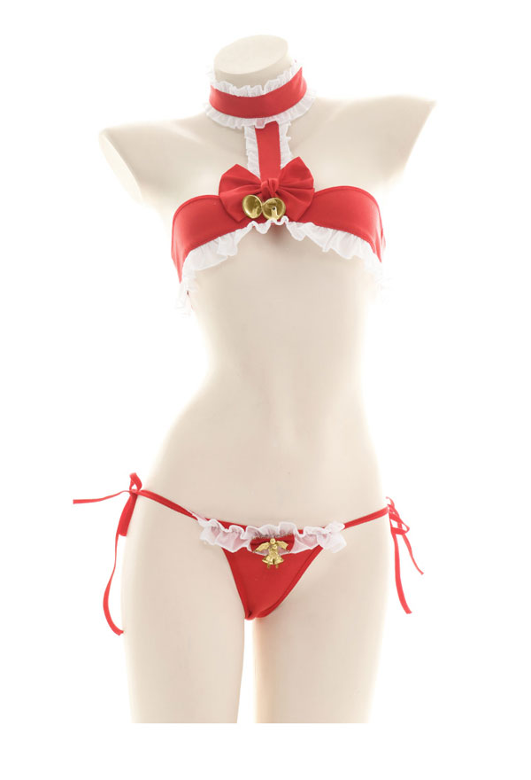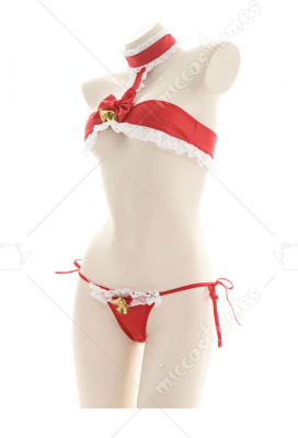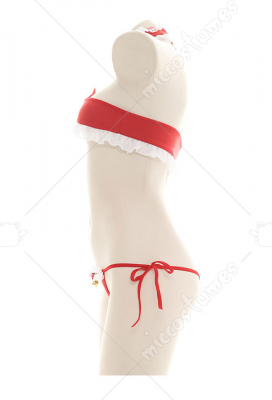 Costume Includes: bikini top, briefs. Material: polyester. Design Details: The top is halterneck style which is sexy and charming. Bells of the costume increases the atmosphere of Christmas holiday.