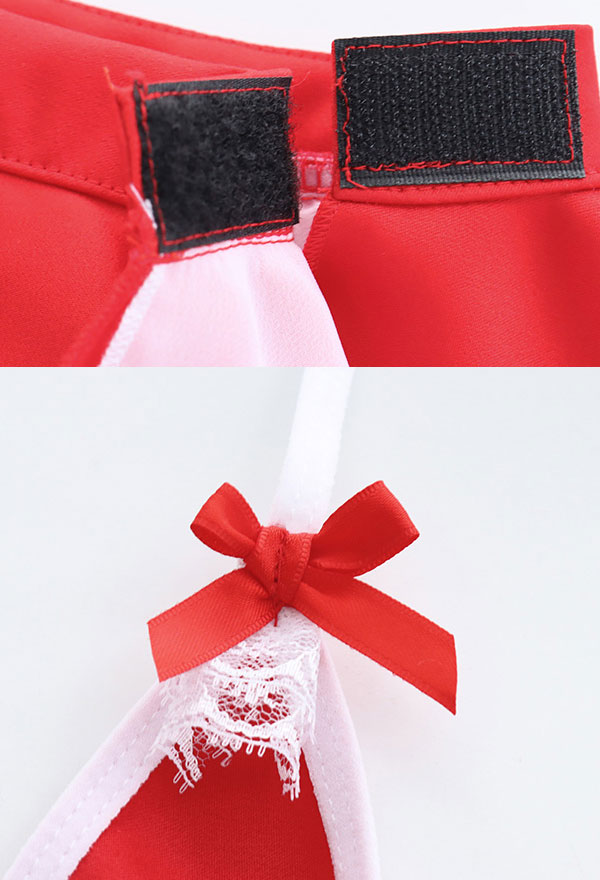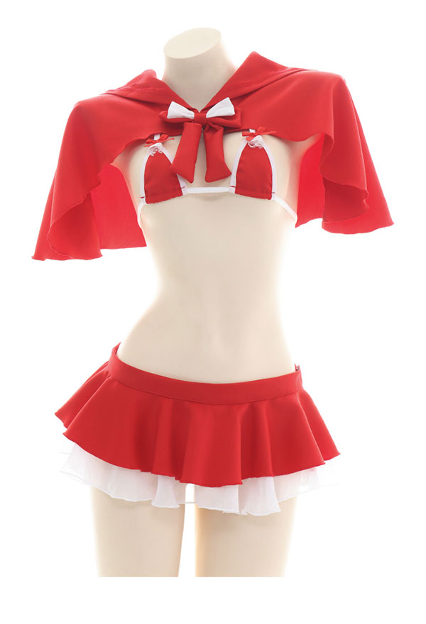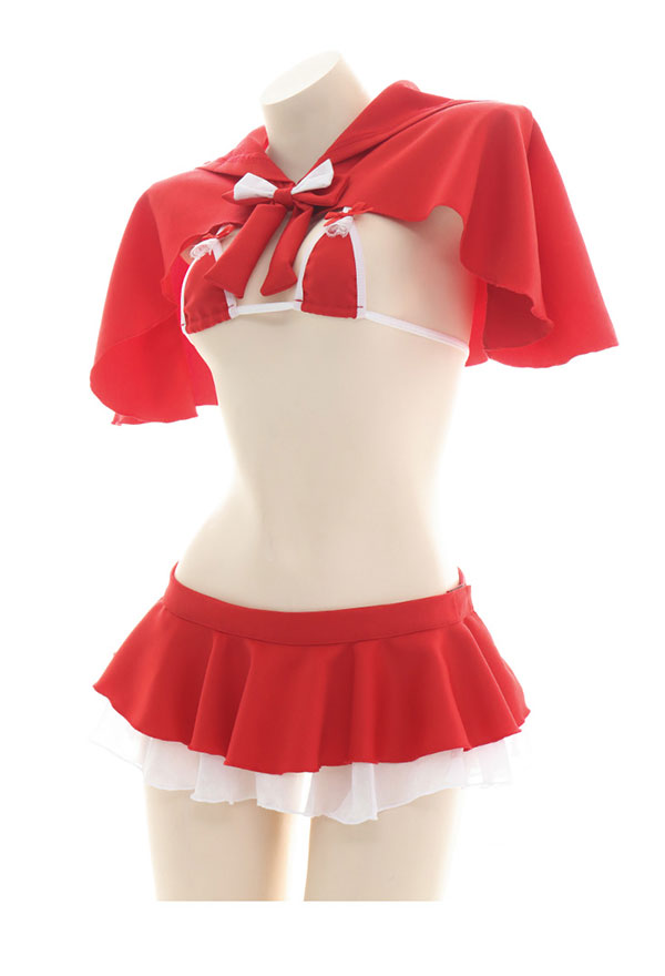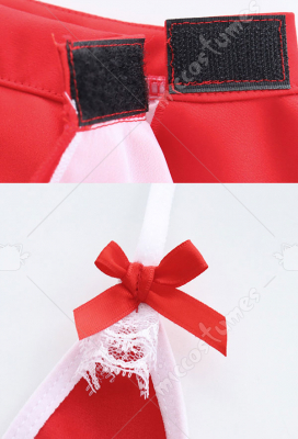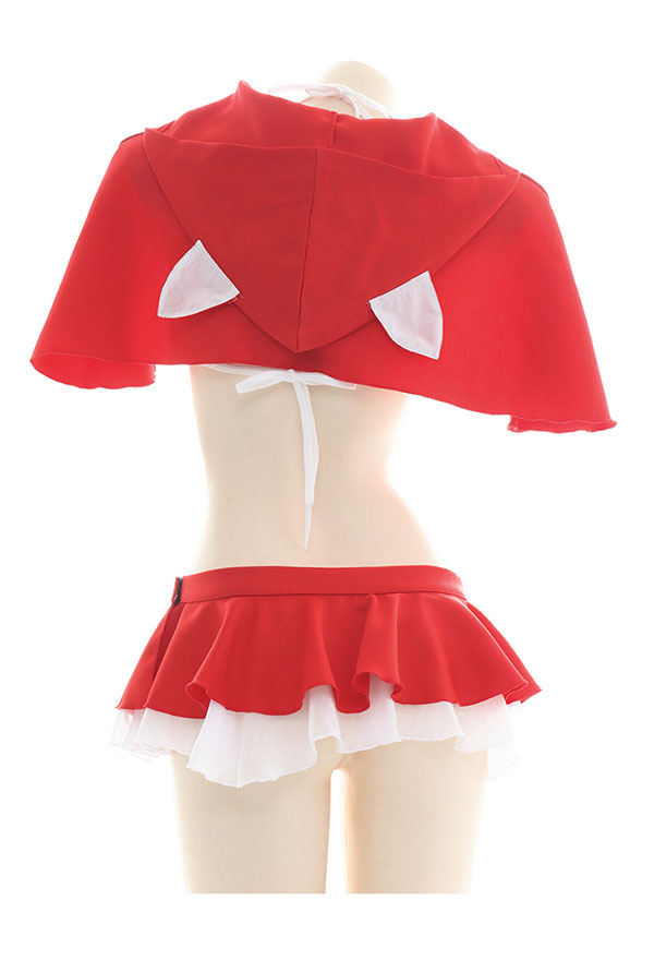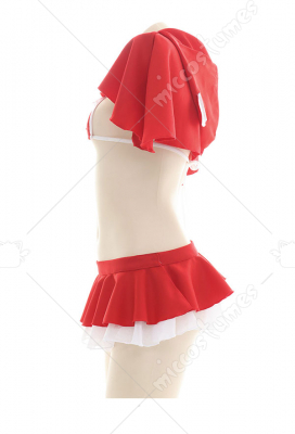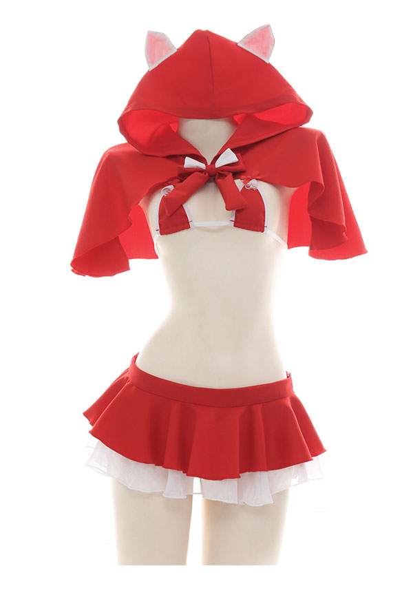 Costume Includes: cloak, bikini top, skirt. Material: polyester. Design Details: Cat ears of the cloak are so cute and vivid. The cloak is suitable for other costumes too. Lace ruffles and bowknots are used on the bikini top, which delivers cute and sexy feelings.