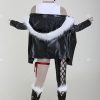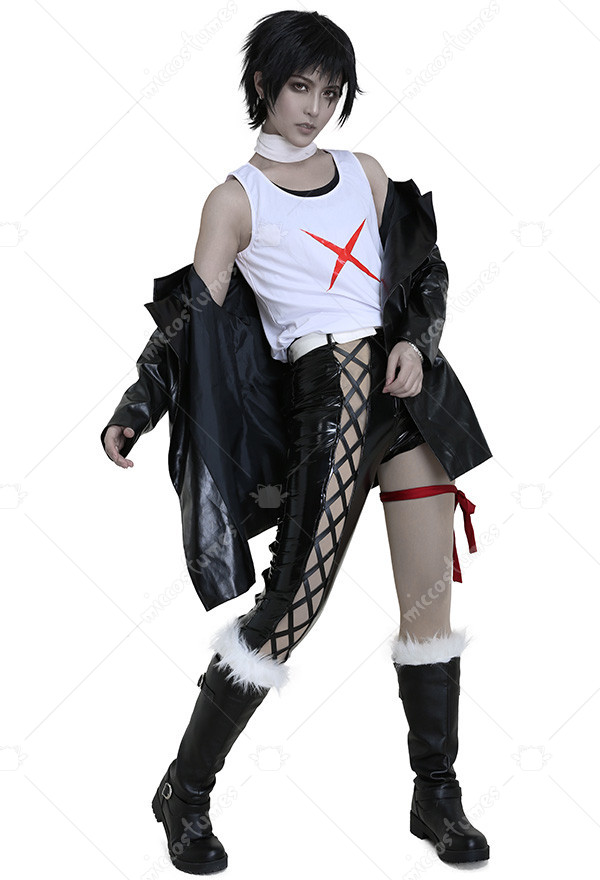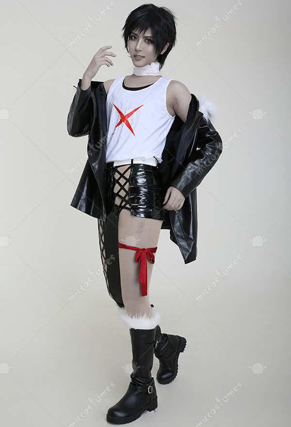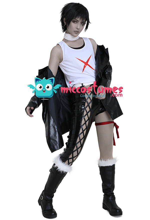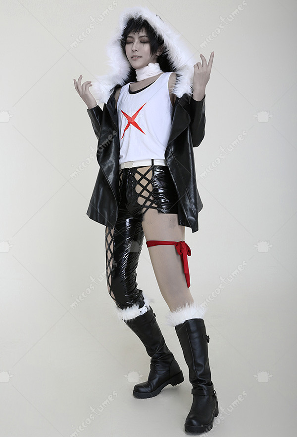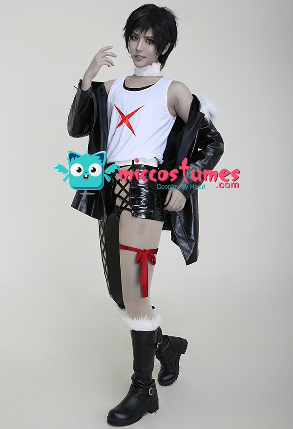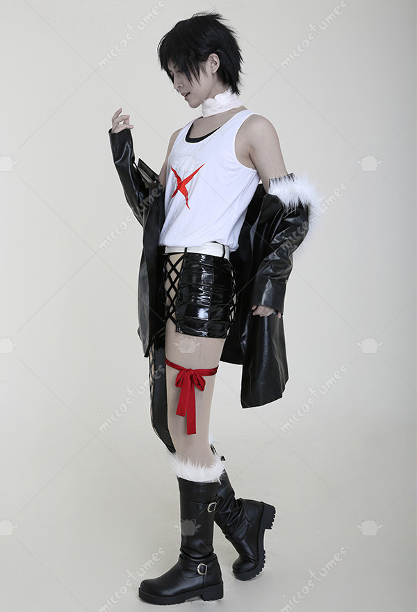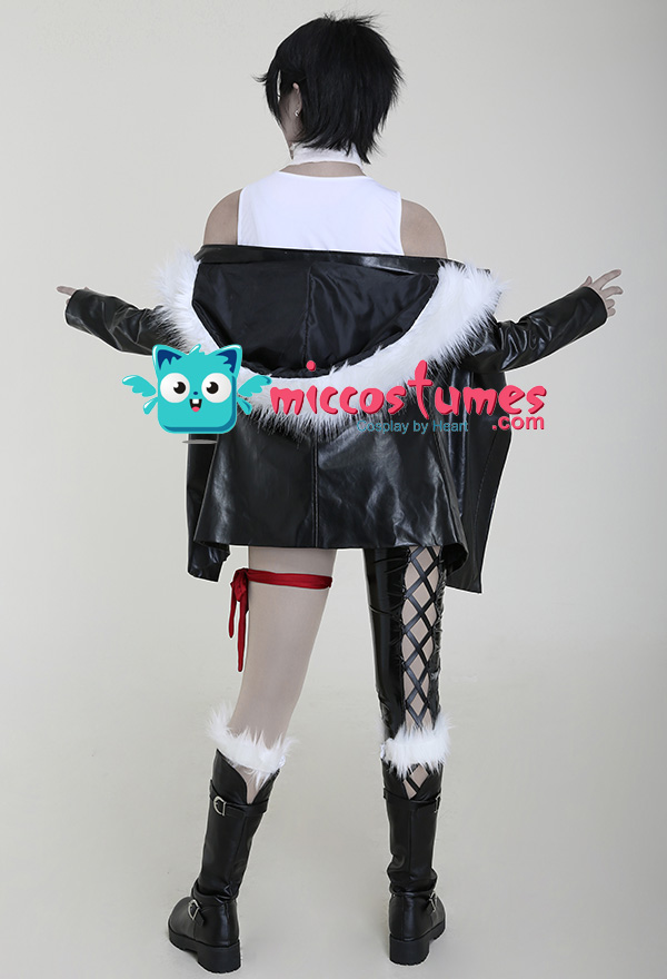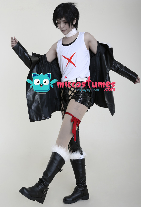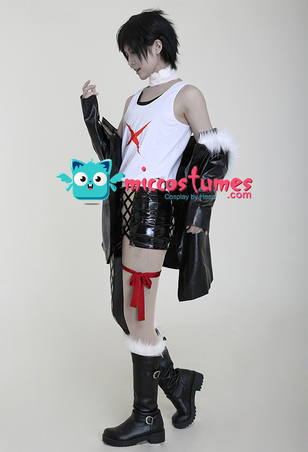The costume includes coat, vest, pants, leg strap*1, neck bandage*1, shoe accessory*2, belt. It is made of spandex, PU leather, lining, faux fur.