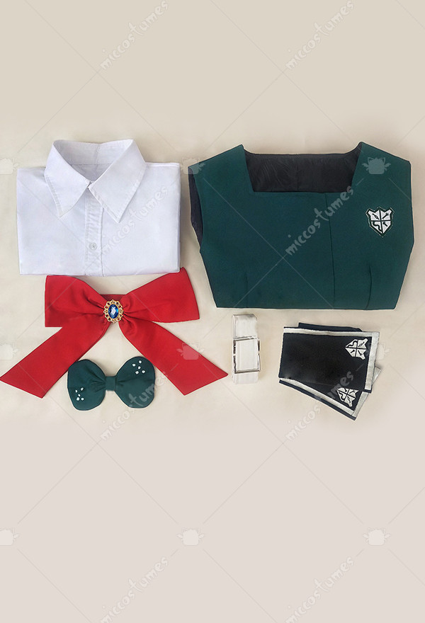 The costume includes dress, hair accessory*1, tie, shirt, belt, stockings. It is made of knitted fabric, uniform cloth.