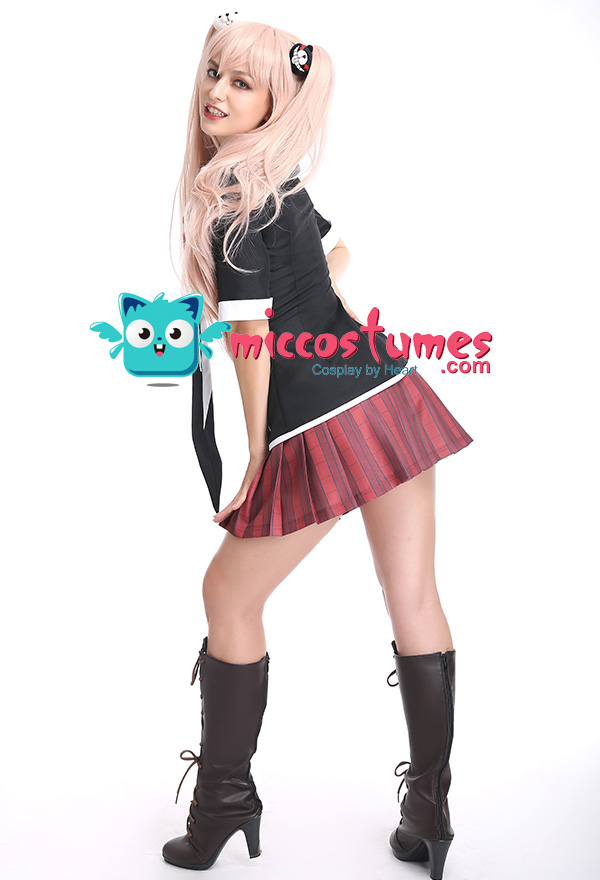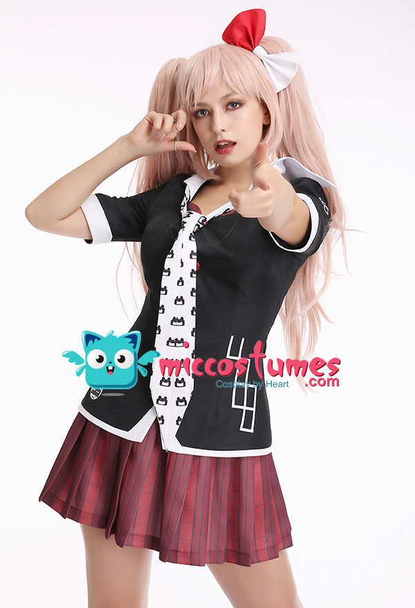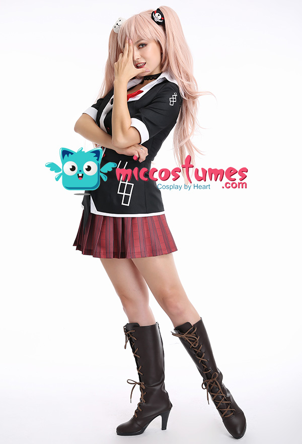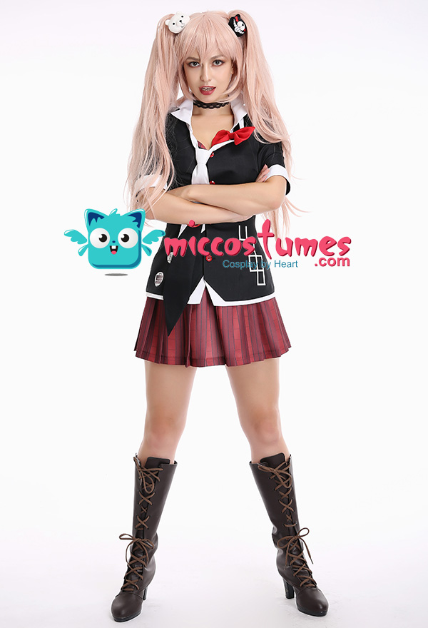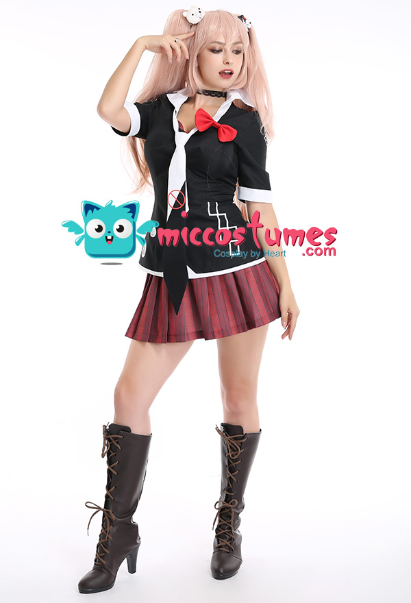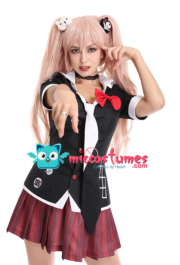 This costume includes uniform top, skirt, hair accessory*3, choker*1, tie*2, chest bowknot*1. It is made of uniform cloth. Notice: You can cosplay two classic looks of Junko Enoshima by ordering this costume. It includes two sets of accessories which are bear headdress*2, bow hair accessory*1, choker*1, tie*2 and chest bowknot brooch*1.