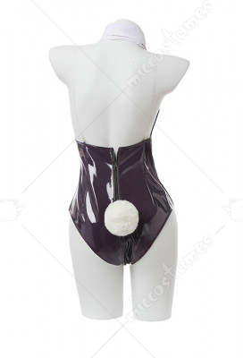 Costume Includes: bodysuit, fake collar, tie, glove*2, armband*2, invisible bra strap*2, rabbit ear hairband*1, headband*1, stockings*2, fluffy tail*1. Material: faux leather.