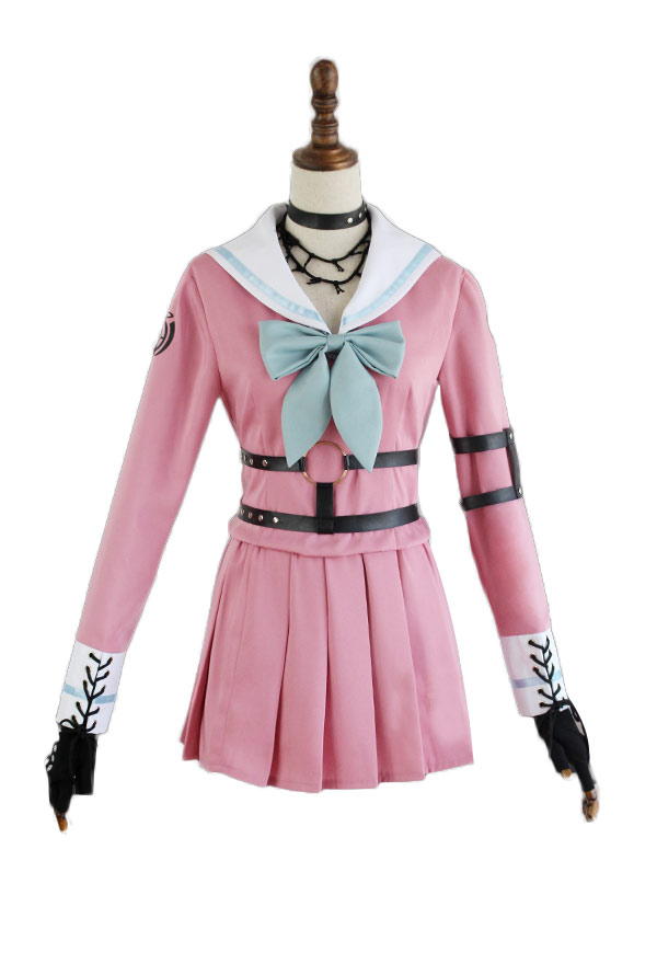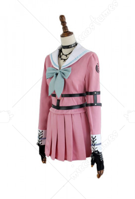 This costume includes shirt, skirt, neckwears x2, belt, arm accessory, gloves, socks, leg accessory. It is made of uniform cloth. Pink color costume collaborates with the blue bow tie, cute and chic.