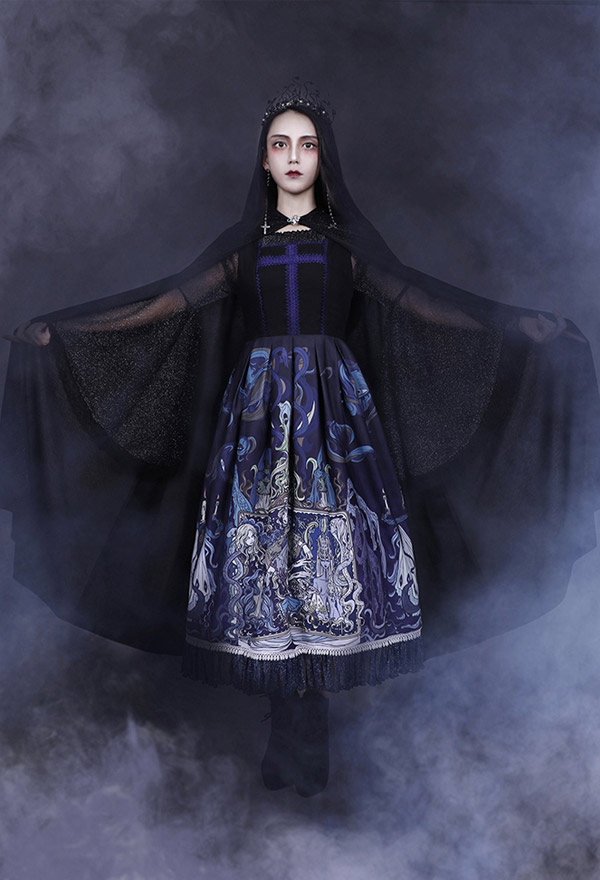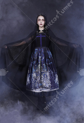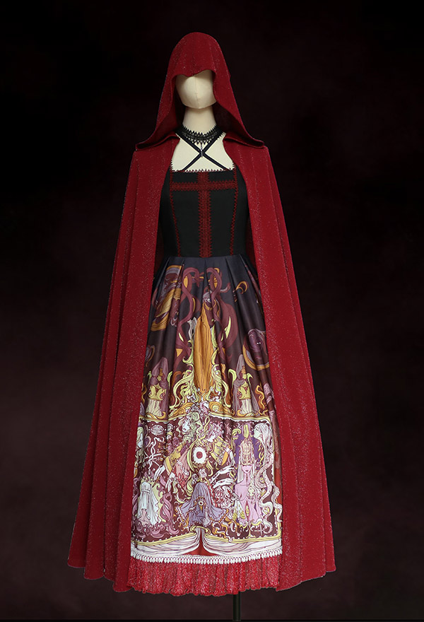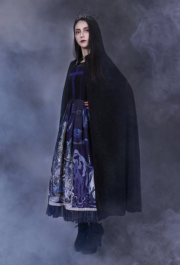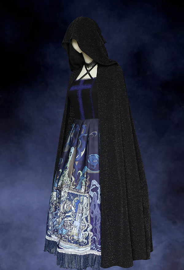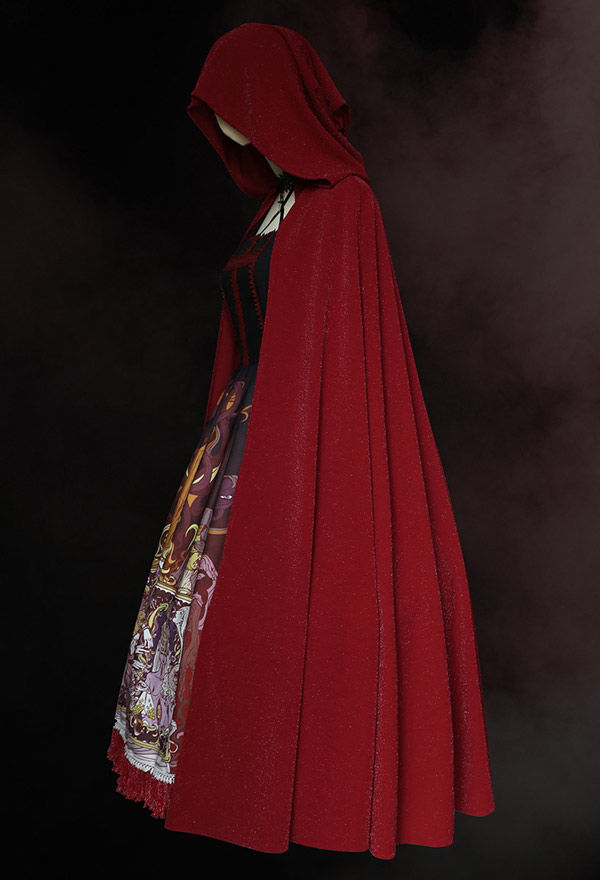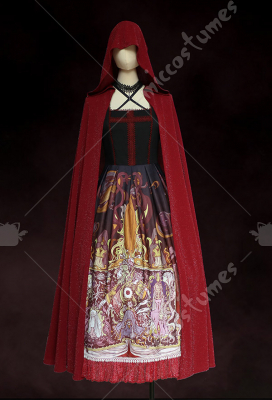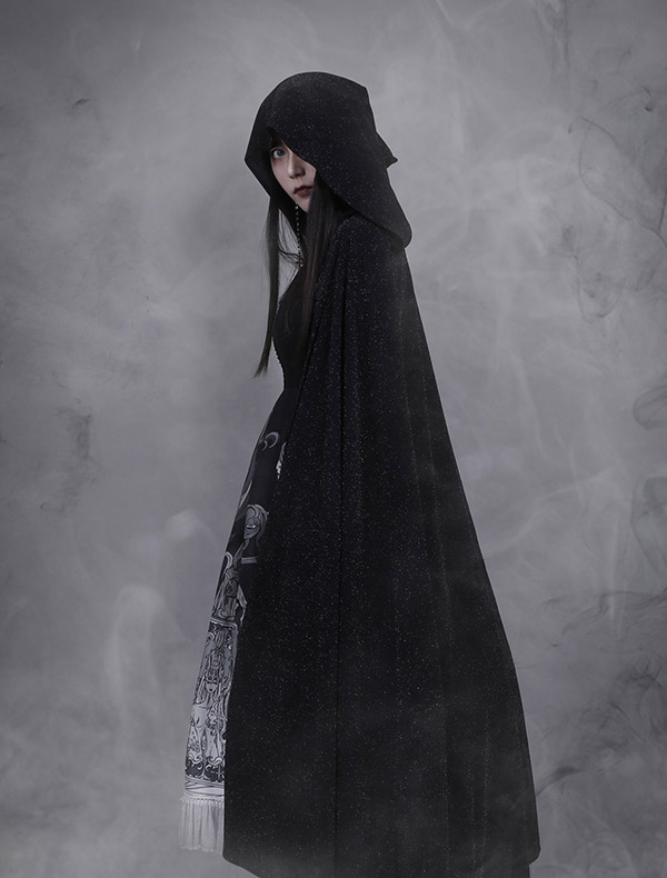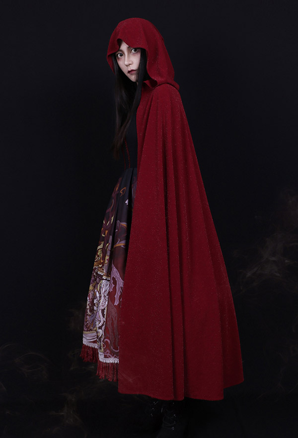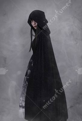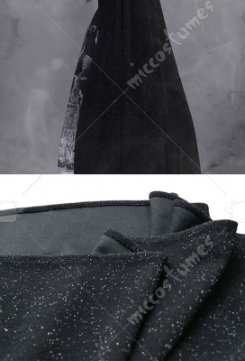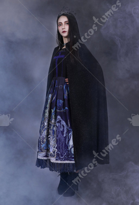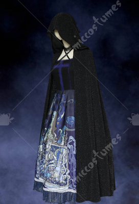 The costume includes the cloak only, other accessories are NOT included. It is made of knitting fabric and it is shiny.