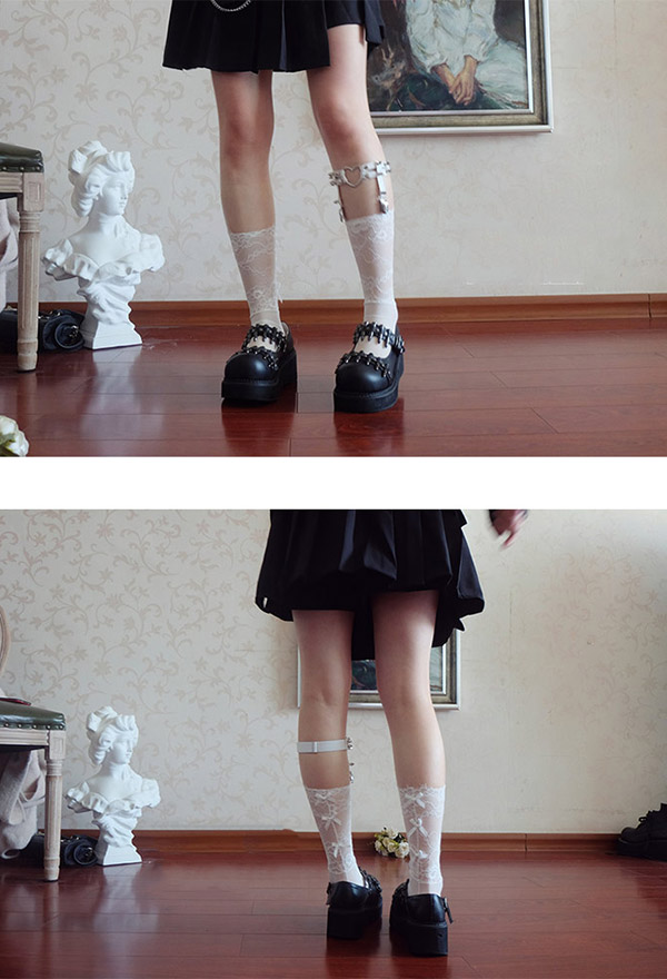 The accessory includes stockings and leg harness. Stockings are made of lace.