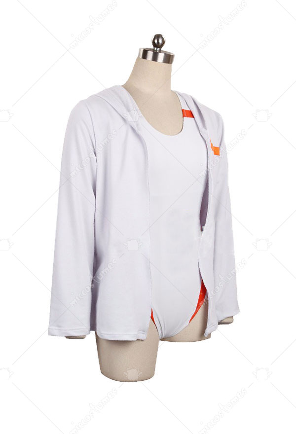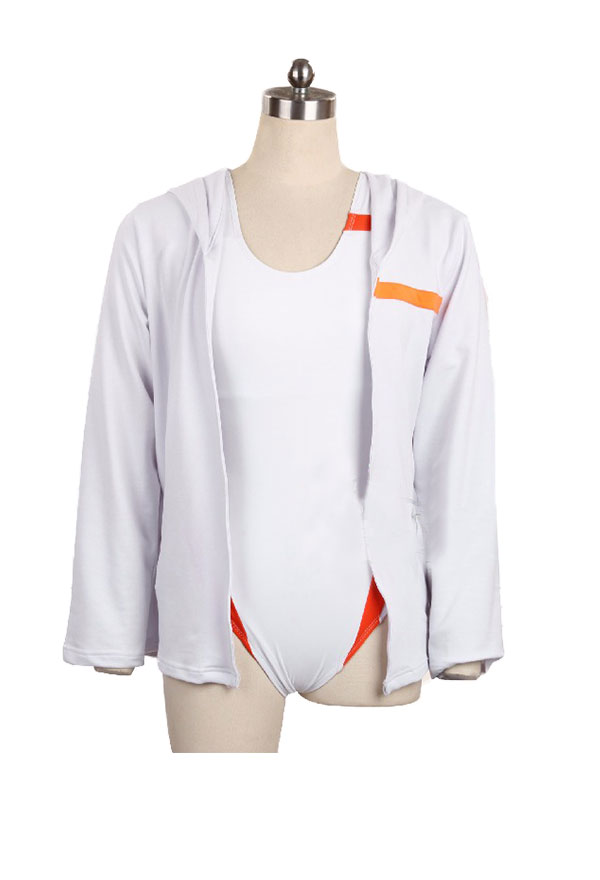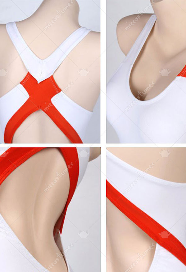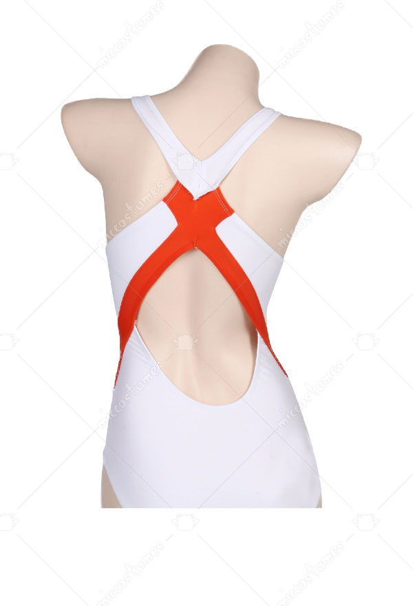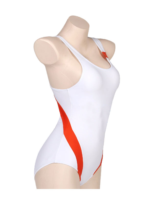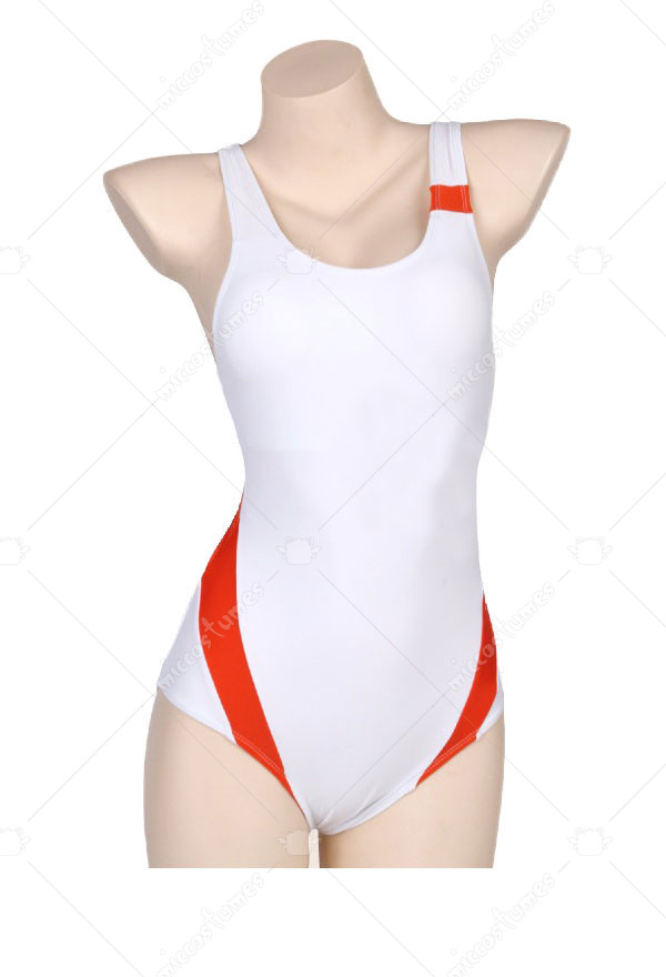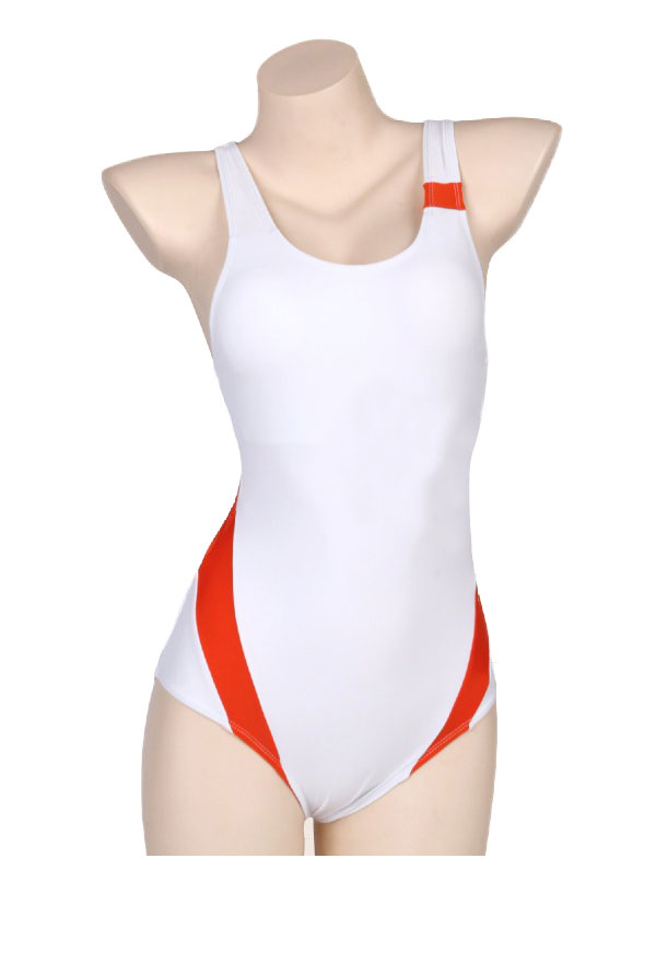 The main material is matt nylon fabric. The costume includes one-piece swimsuit with bra pads.