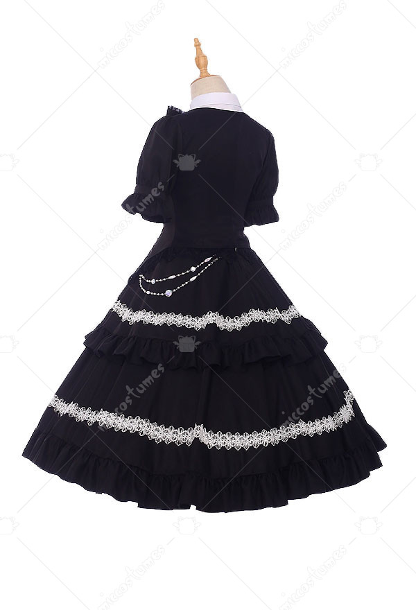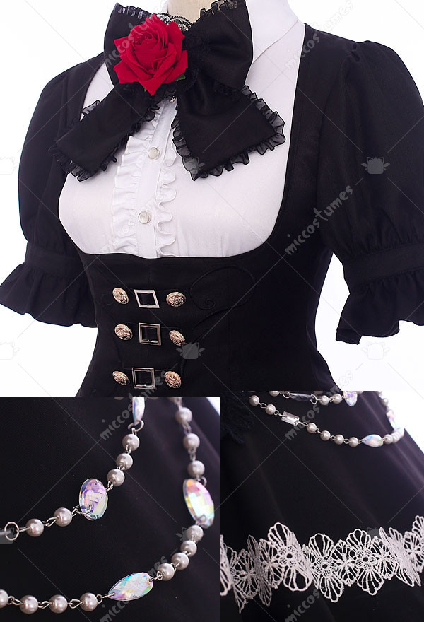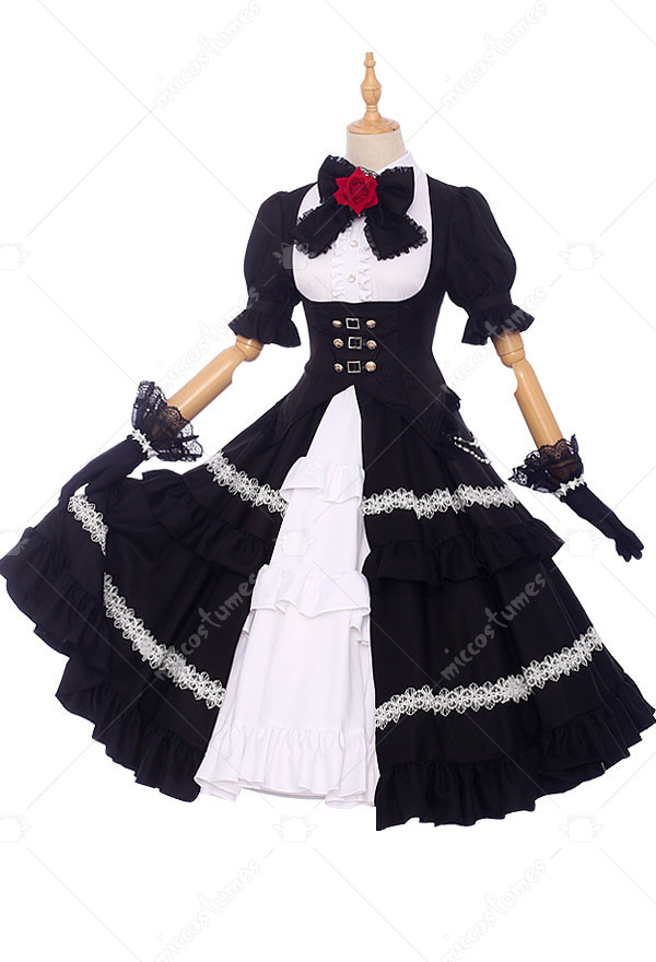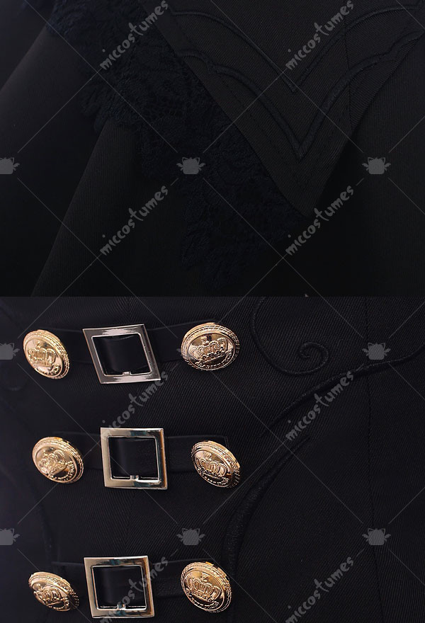 The costume includes dress, coat, glove*2, waist accessory, bowknot tie, headdress, eye patch, stockings. It is made of lace, twill fabric.