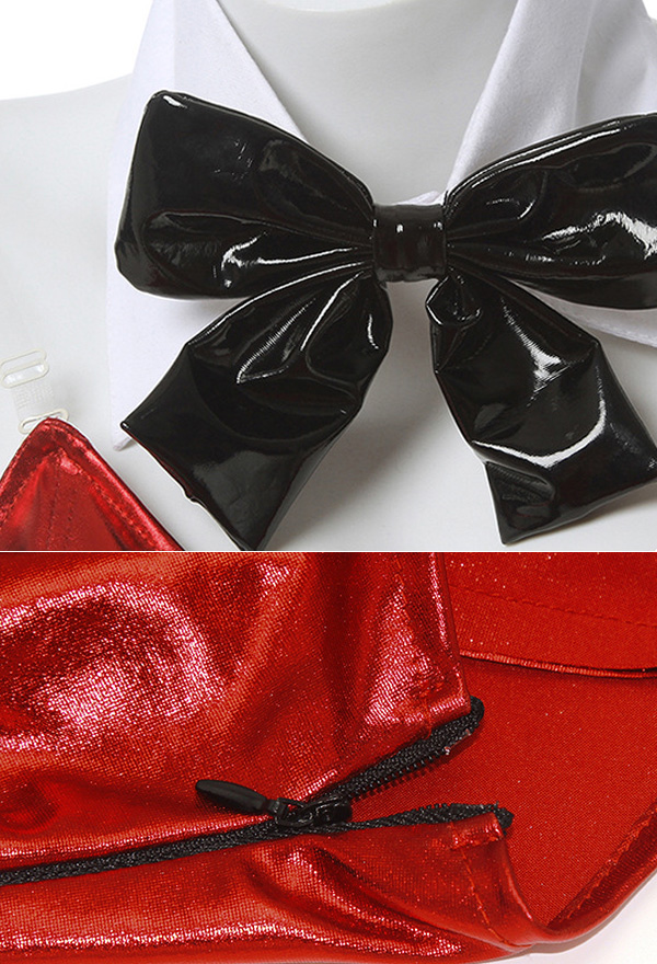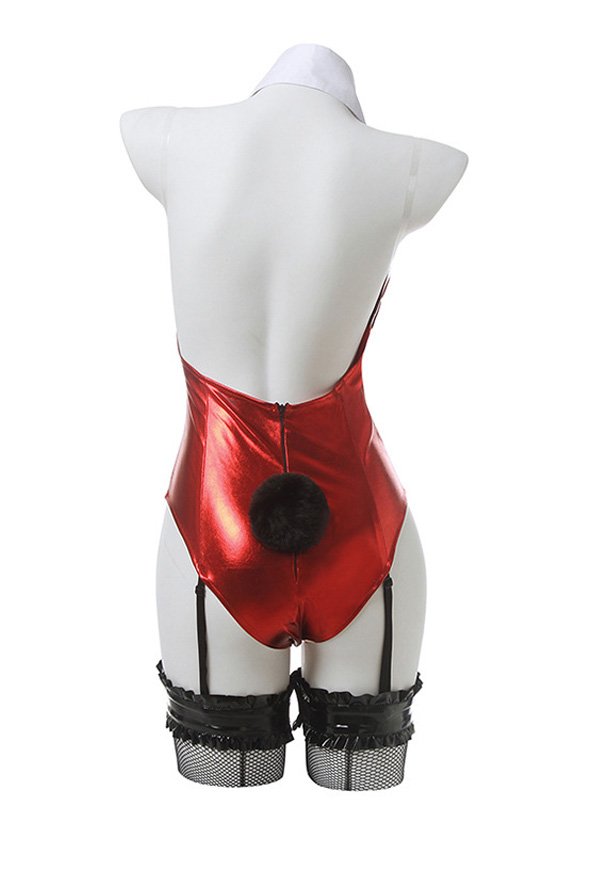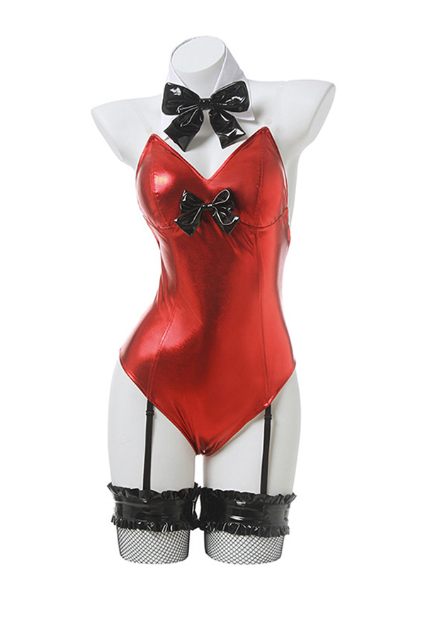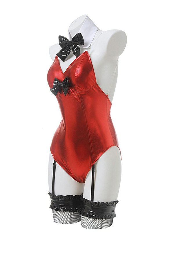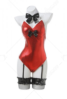 Costume Includes: bodysuit, fake collar, bowtie, glove*2, wristband*2, invisible bra strape*2, hairband, chest bow, fishnet stockings, card*3 Material: patent leather