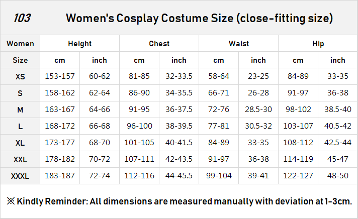 1)Our costumes are made in a variety of different materials with specialized stitching and parts, so your usual size will not apply here.