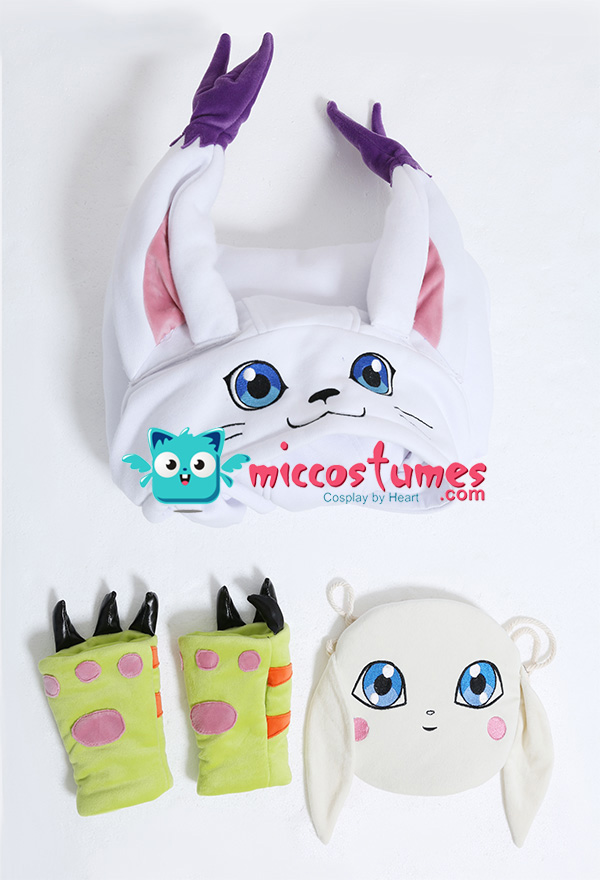 Costume Includes: hoodie, crossbody bag, gloves*2. Material: cotton, silver fox velvet, jumpsuit fabric. Design Details: The hooded coat adopts image of Tailmon as the design inspiration. The body is made of soft silver fox fluff, and both the hoodie hat and cross body bag are delicately embroidered. The coat can be worn in daily life and is suitable for varities of season.