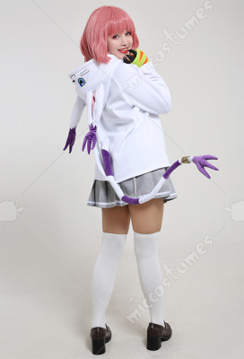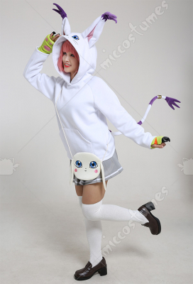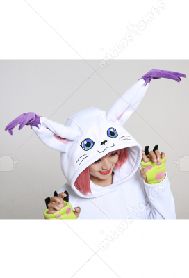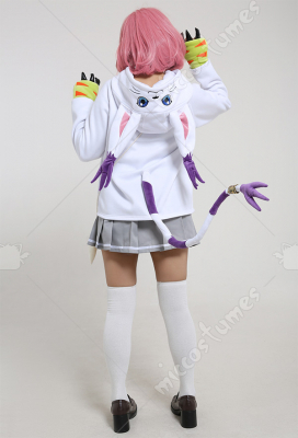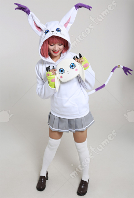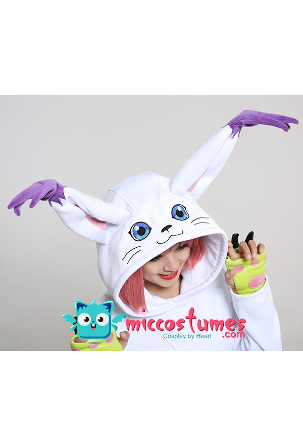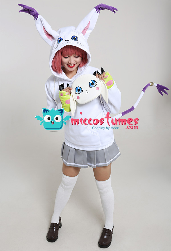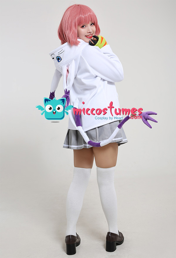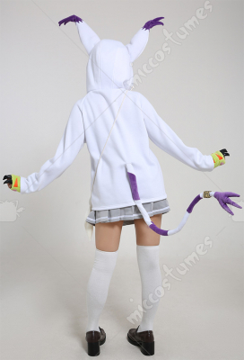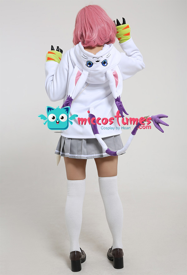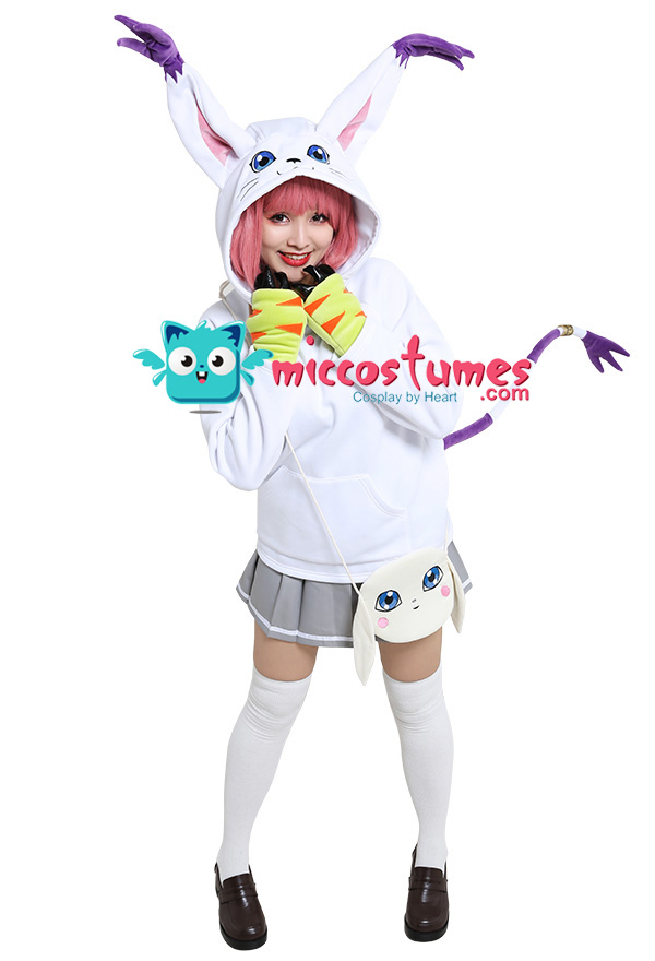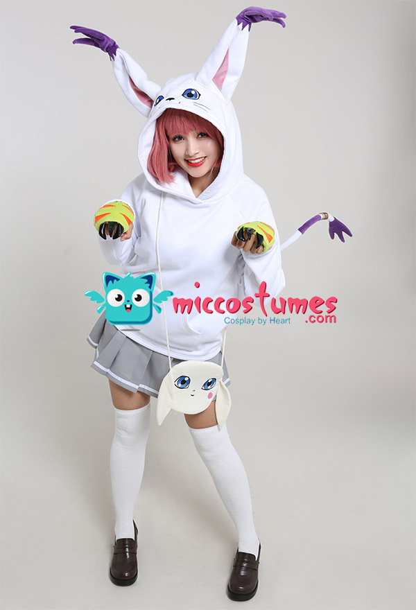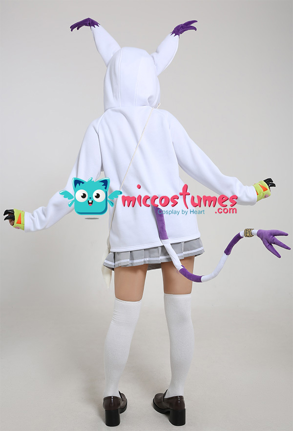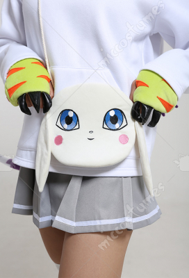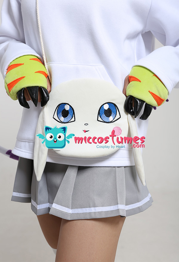 Costume Includes: hoodie, crossbody bag, gloves*2. Material: cotton, silver fox velvet, jumpsuit fabric. Design Details: The hooded coat adopts image of Tailmon as the design inspiration. The body is made of soft silver fox fluff, and both the hoodie hat and cross body bag are delicately embroidered. The coat can be worn in daily life and is suitable for varities of season.