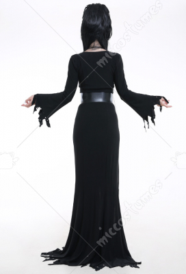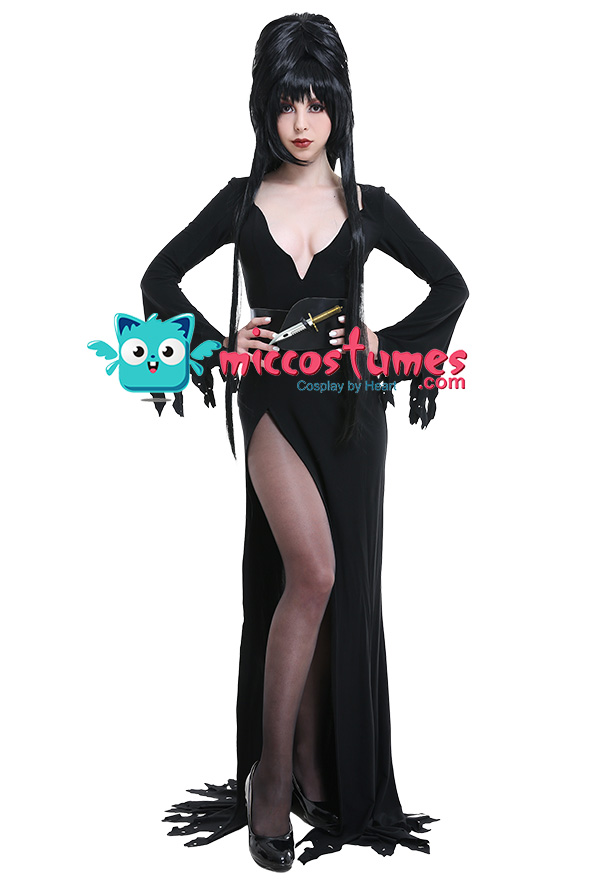 Costume Includes: dress, belt, stockings, fake knife*1. Materials: spandex, PU leather. Design Details: The customized V-type support in collar helps to maintain the collar shape.The collar is a highlight of the dress.