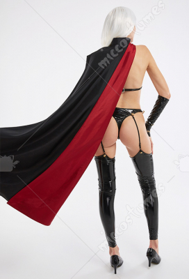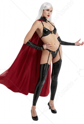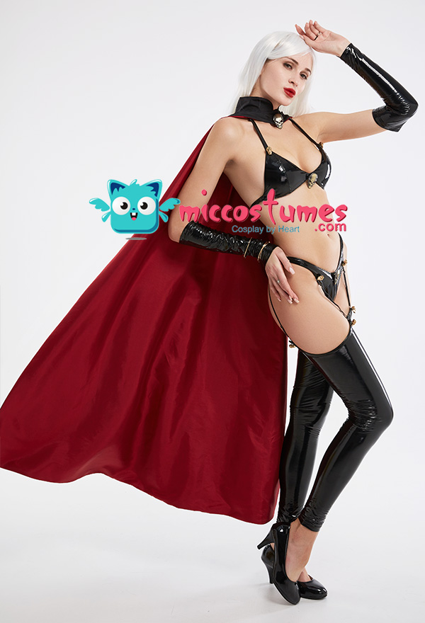 Costume Includes:cape, top, thong, left sleeve, right sleeve, pantyhose*2, bracelets*4, skull decoration*3. Material:pu leather, chameleon fabric, lining fabric. Design Details: This costume is made of elastic pu leather, the cape is made of shiny chameleon fabric, complete with a large number of metal skull props.