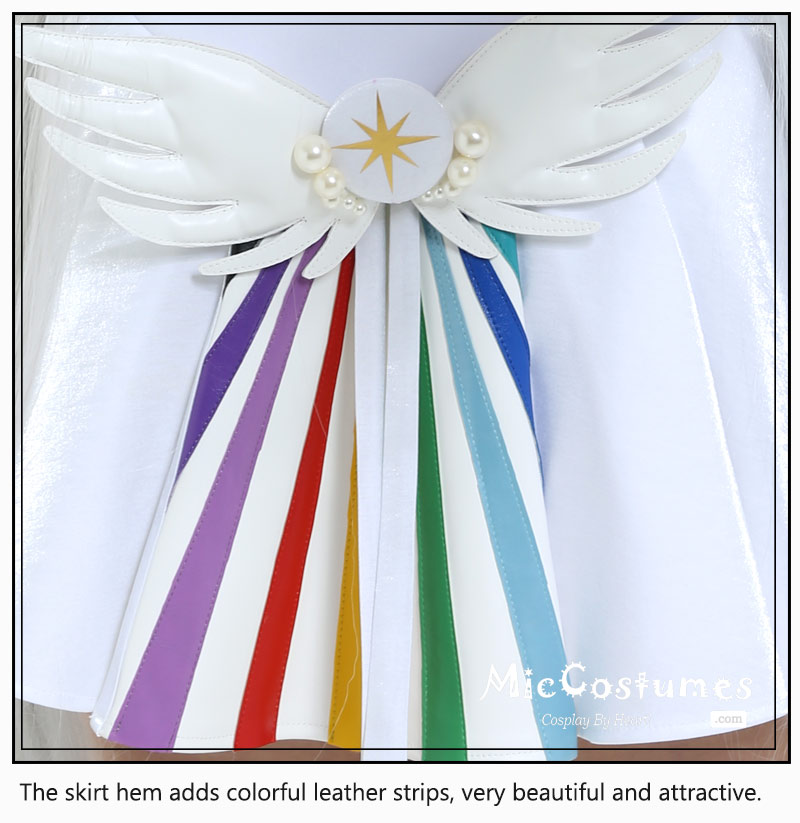 This costume includes dress, cloak, headdress×5, neckwear, chest ornaments, waist ornaments, safety shorts. It is made of fil-lumiere, polyester fibre.