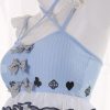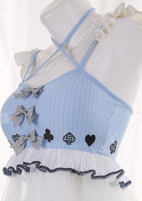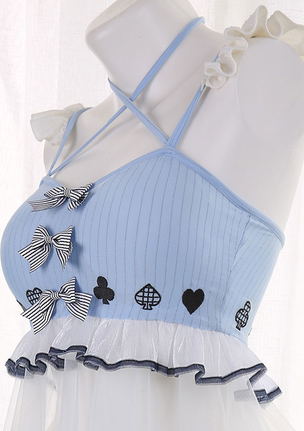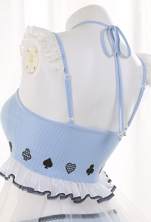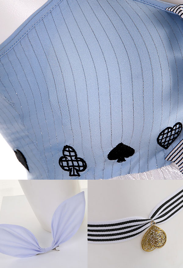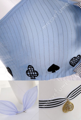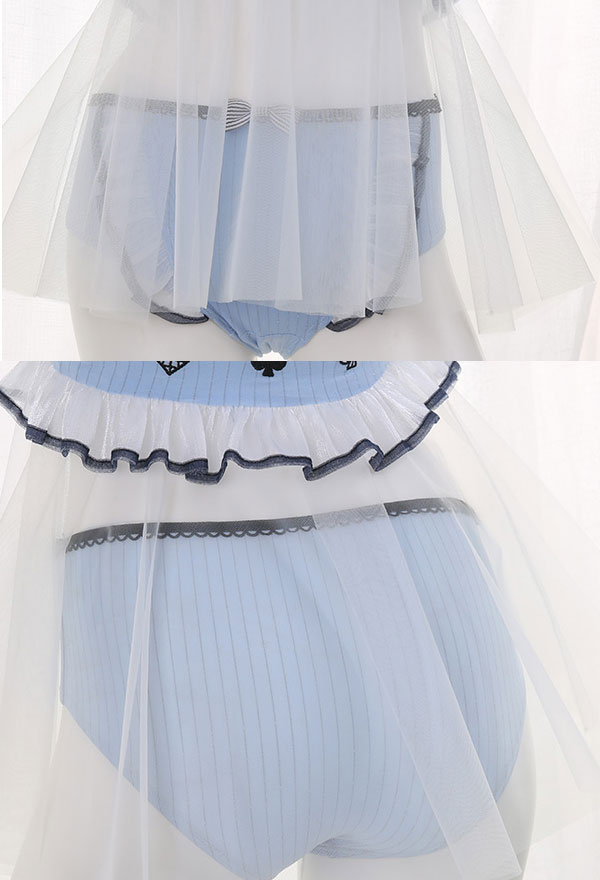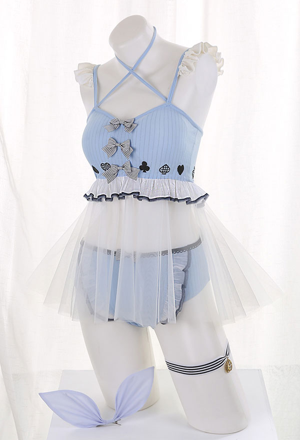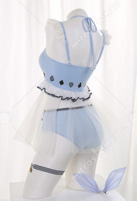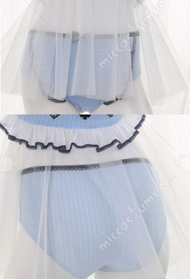 The costume includes swimwear top, head accessory*1, swimwear briefs, thigh ring*1. It is made of gauze.