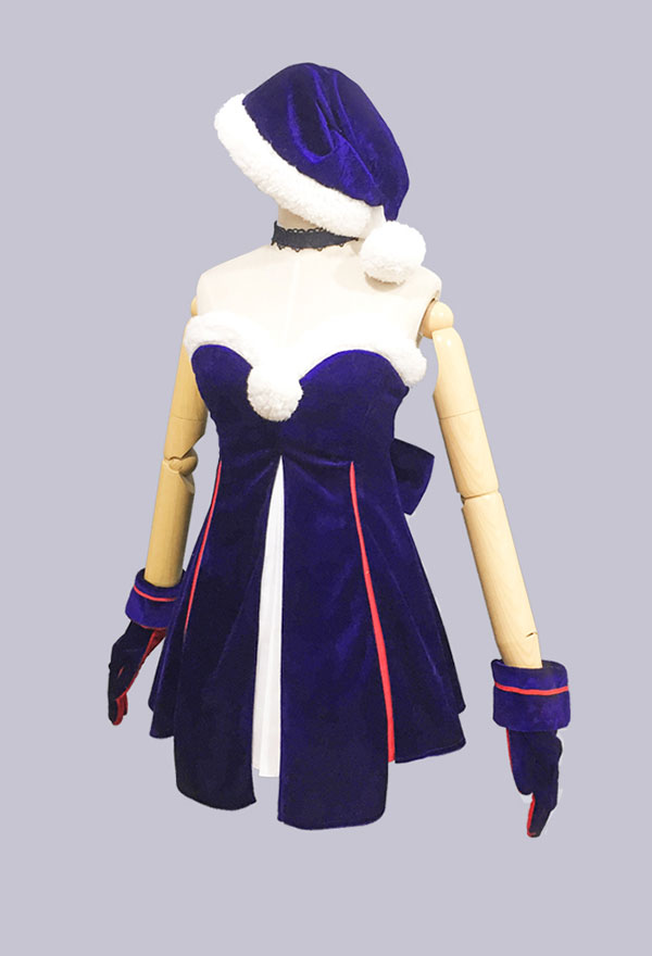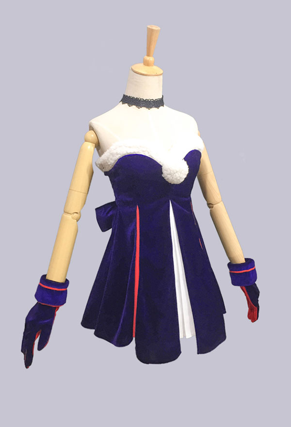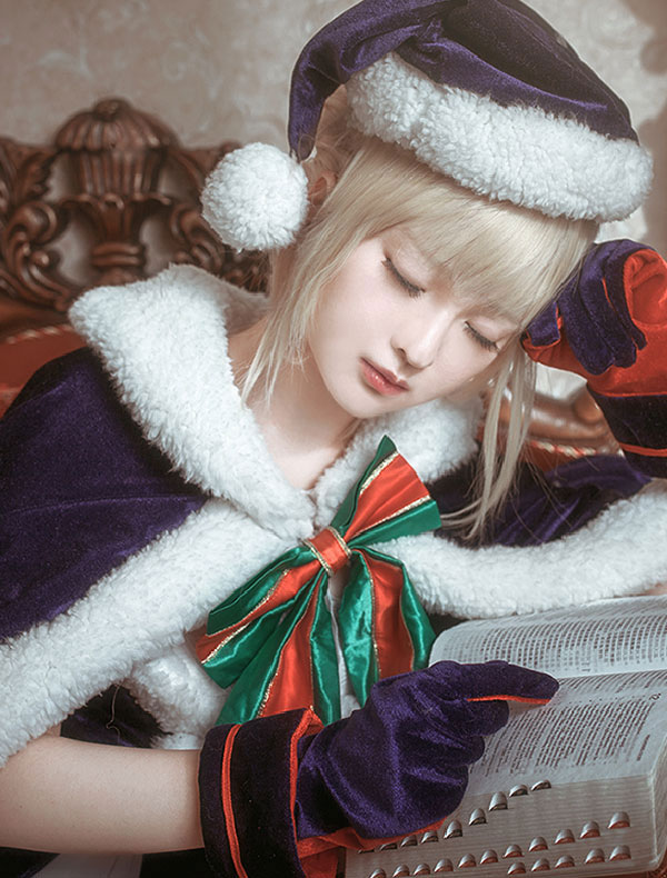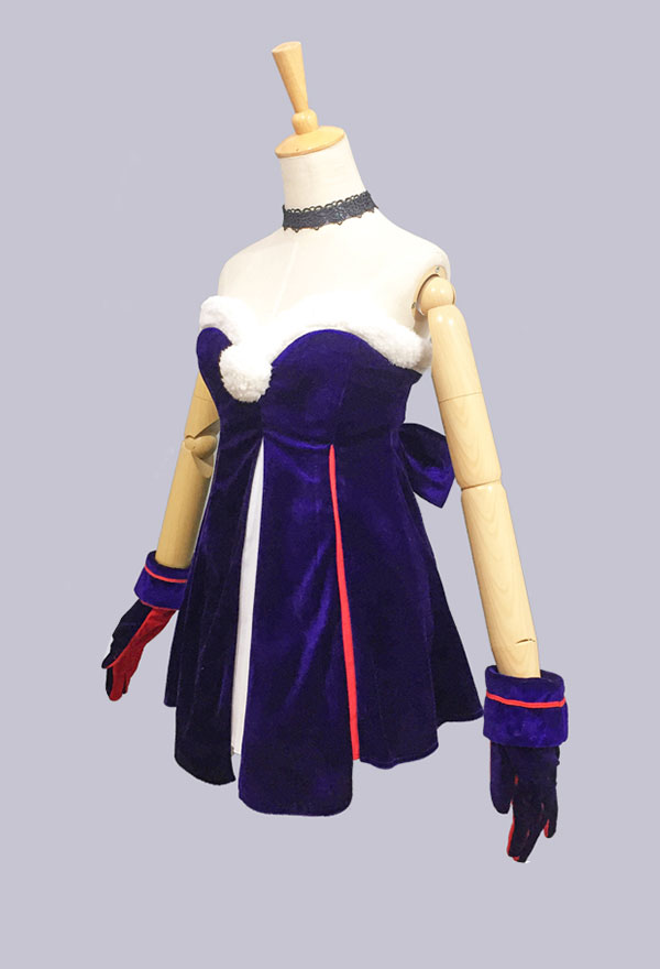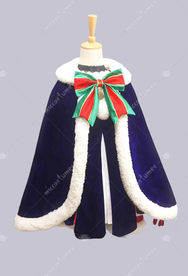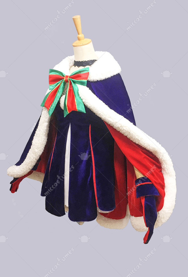 This costume includes cloak, hat, skirt, necklace, bowknot accessories×3, gloves, shoe covers. It is made of the thick velvet with a fluffy texture, which feels very soft.