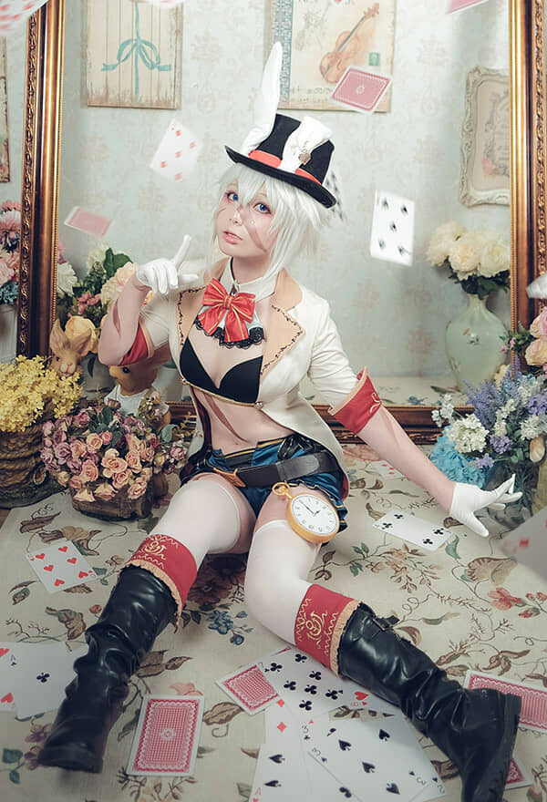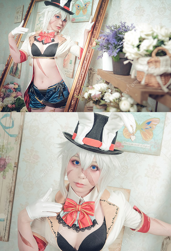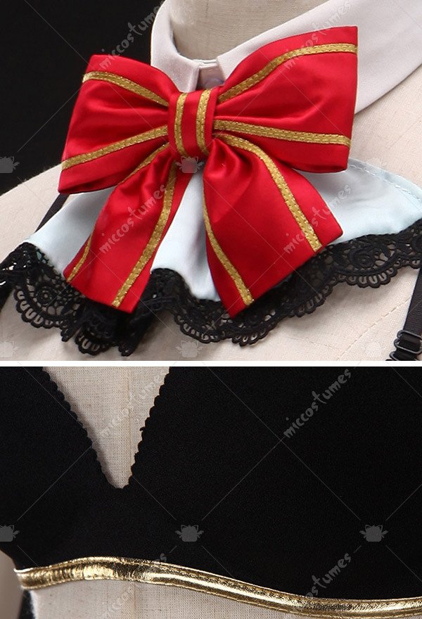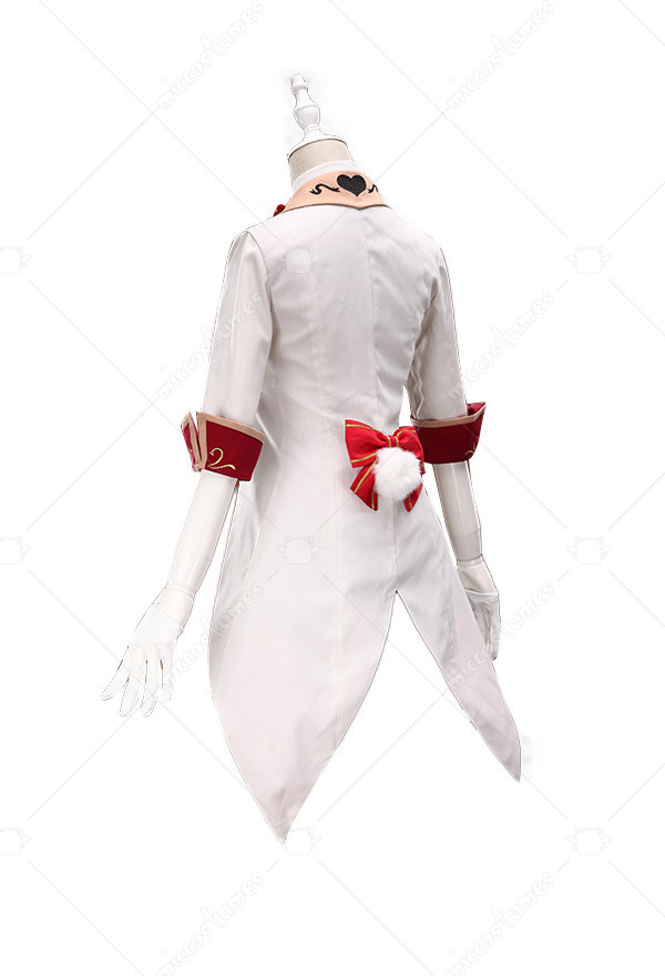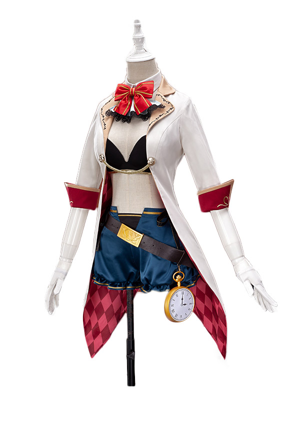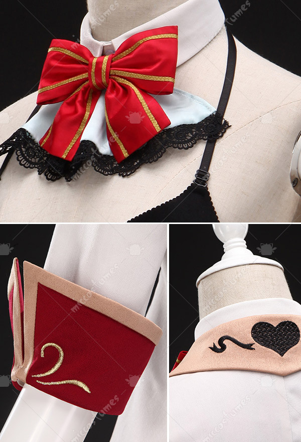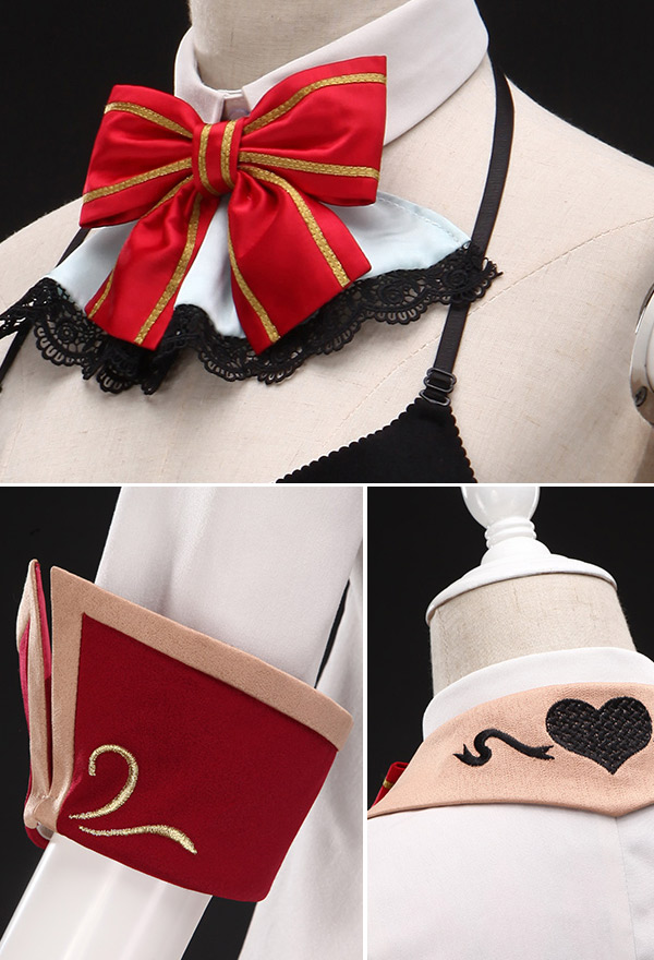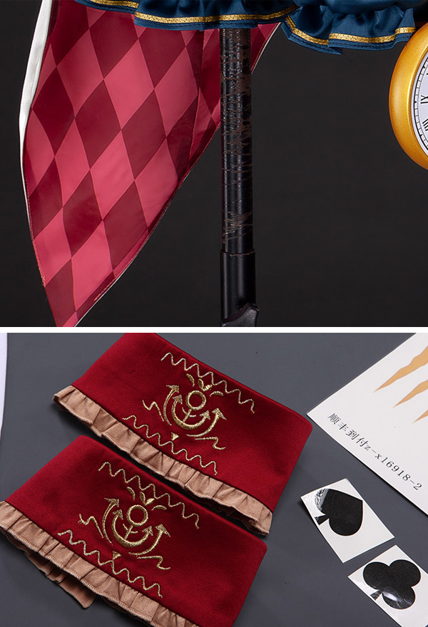 The costume includes coat, top, pants, hat, detachable collar, neckerchief, bow tie, bowknot, strap, gloves, shoe accessory*2, waistband, stockings. It is made of suit twill fabric, satin fabric, spandex fabric and short fluff.