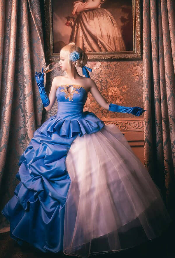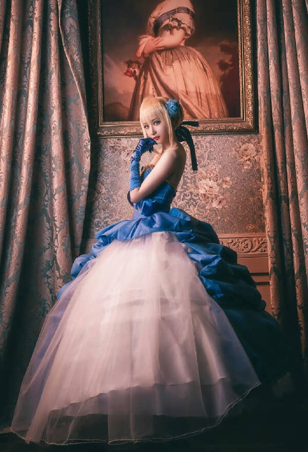 The costume includes dress, glove, headwear, bowknot. It is made of satin, gauze.