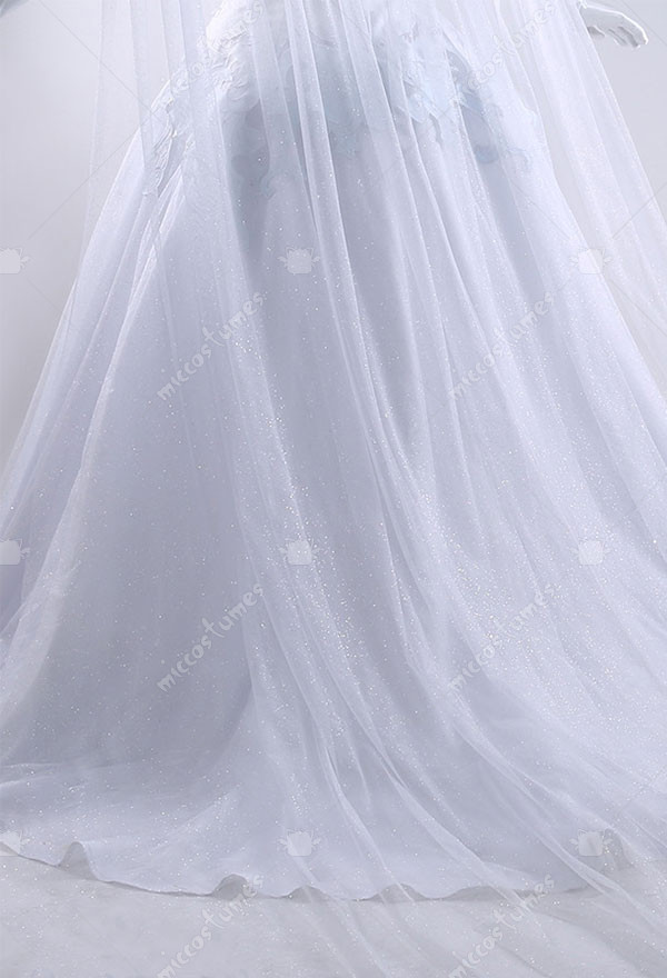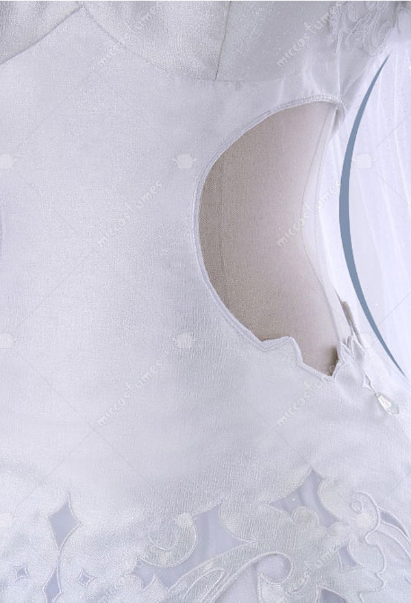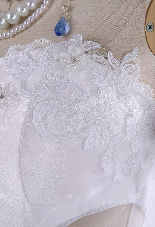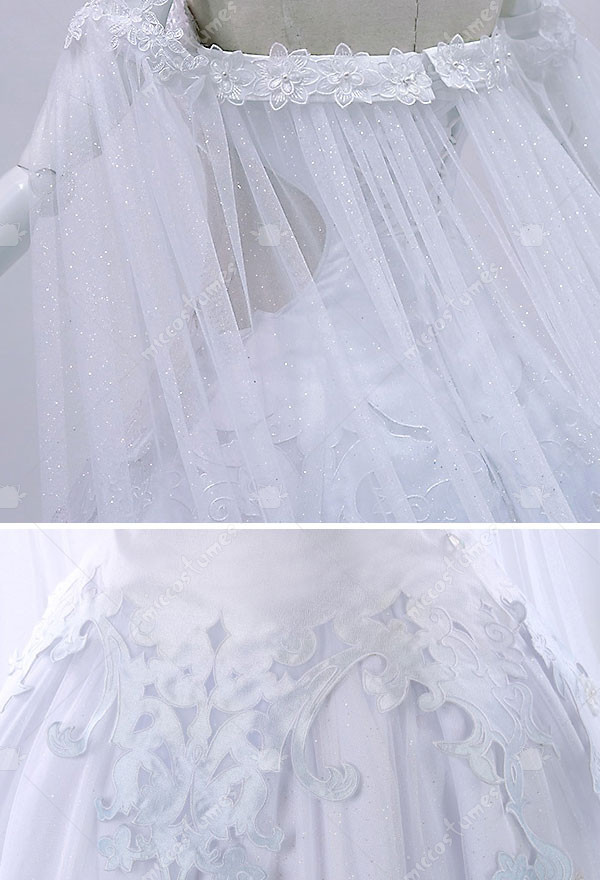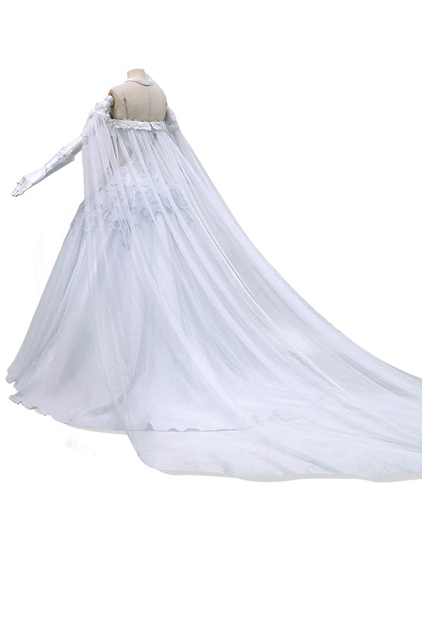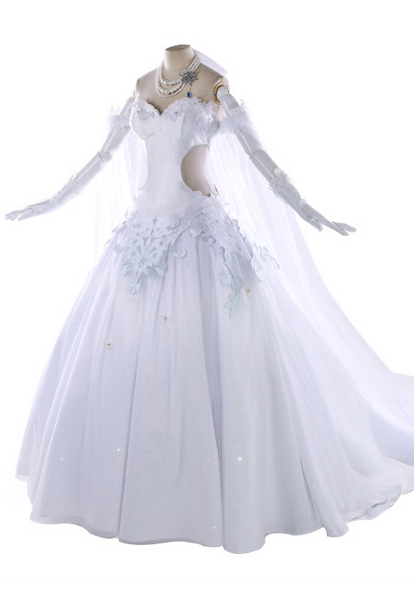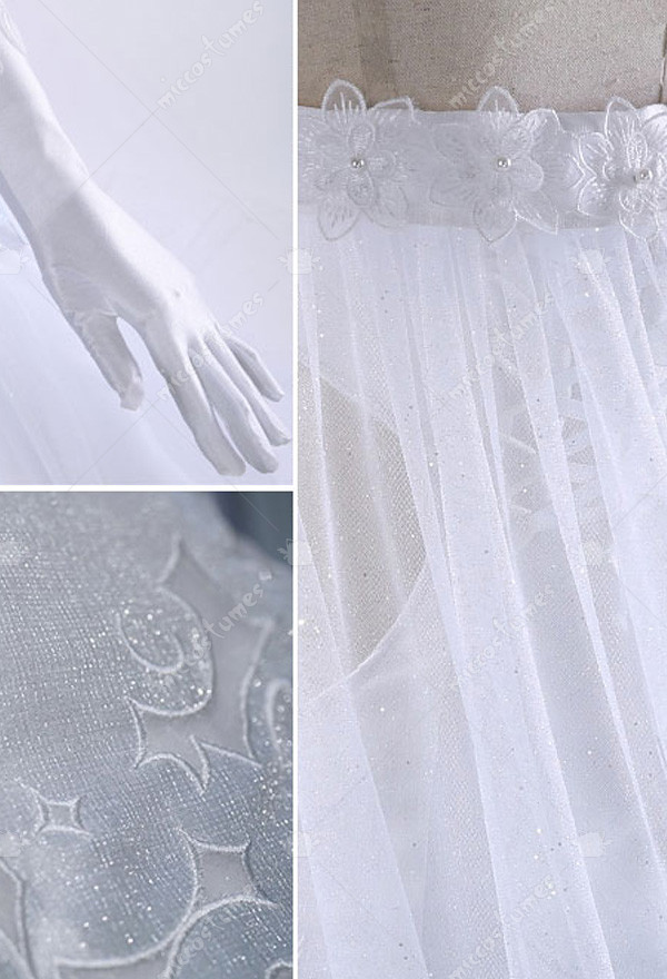 This costume includes dress, veil, headdress, gloves, necklace, earrings, straps. It is made of silver satin, shredded yarn. This costume is made of high-quality material, carefully manufactured, and classic color, worth buying.