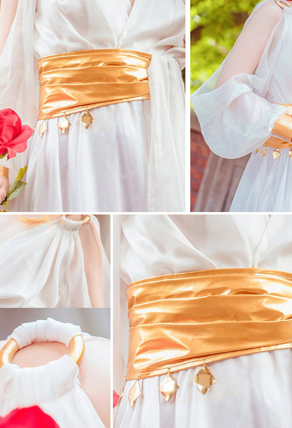 This costume includes dress, underskirt, belt, headdress. It is made of chiffon, matte gold leather.