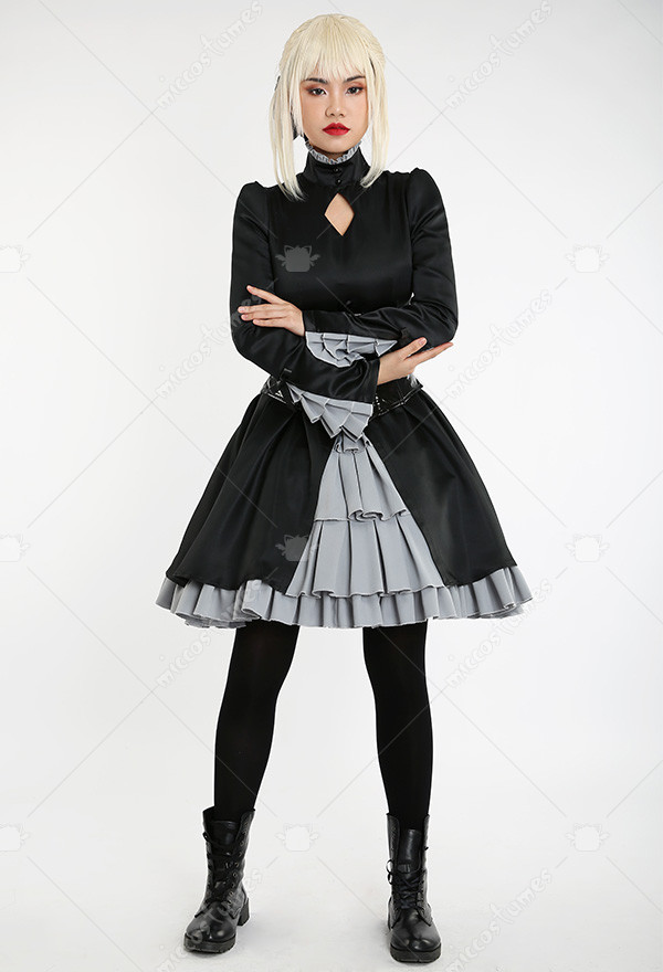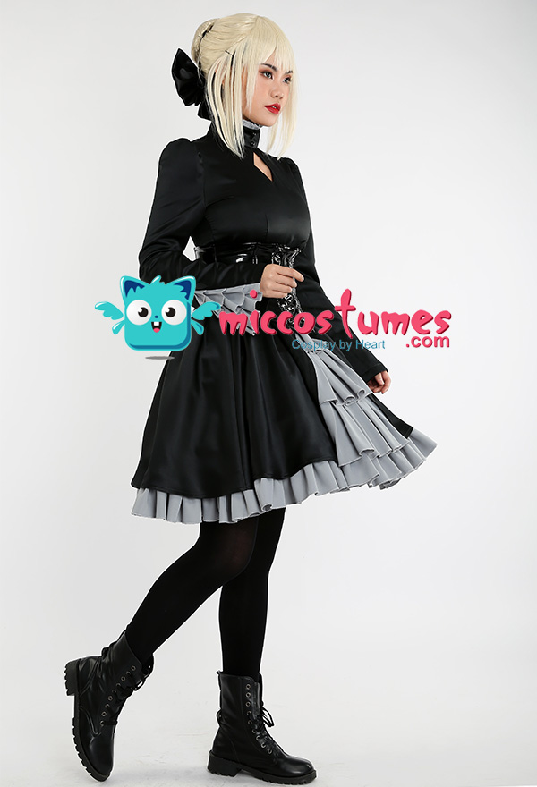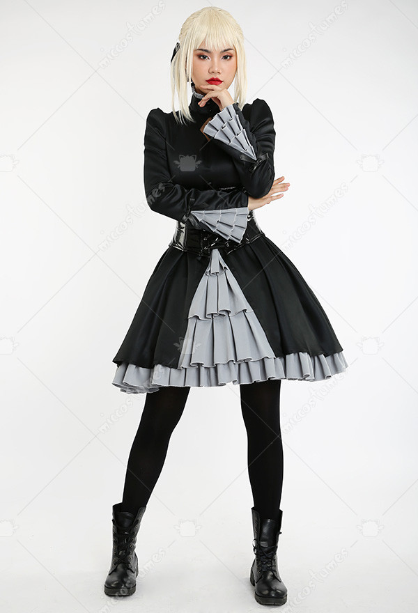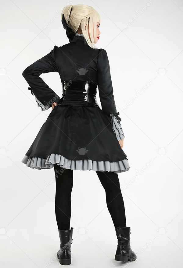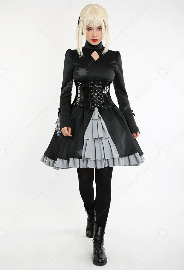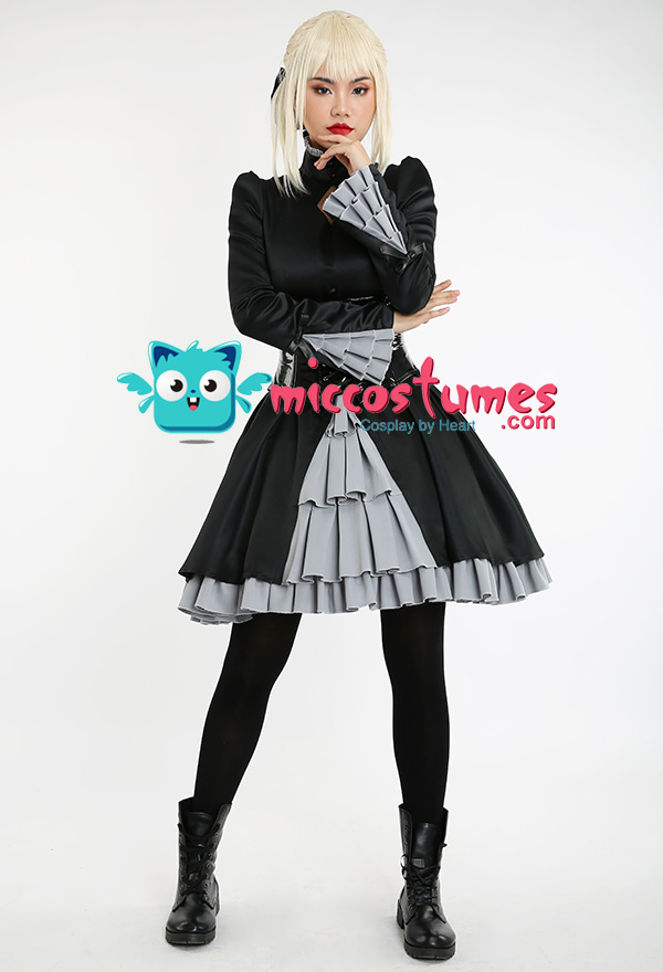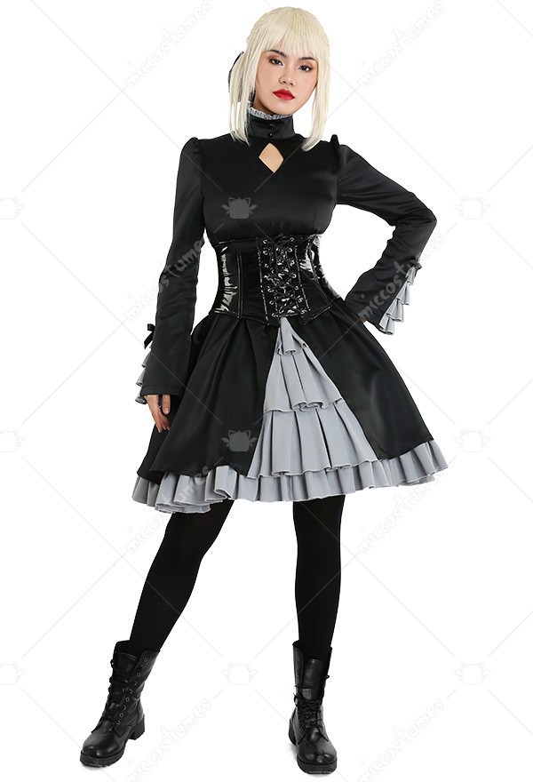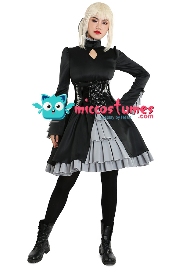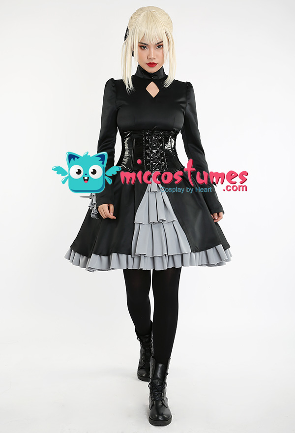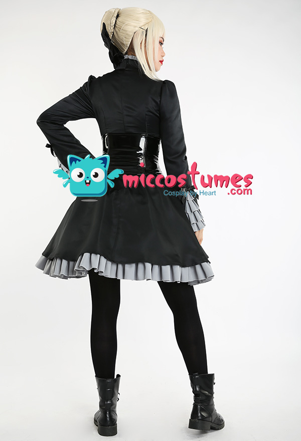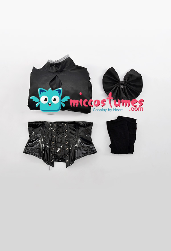 The costume includes headdress, dress, corset, petticoat, pantyhose. It is made of PU leather, satin, polyester.