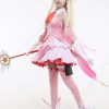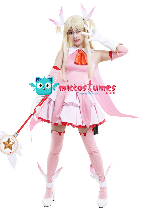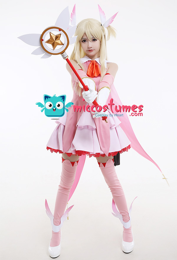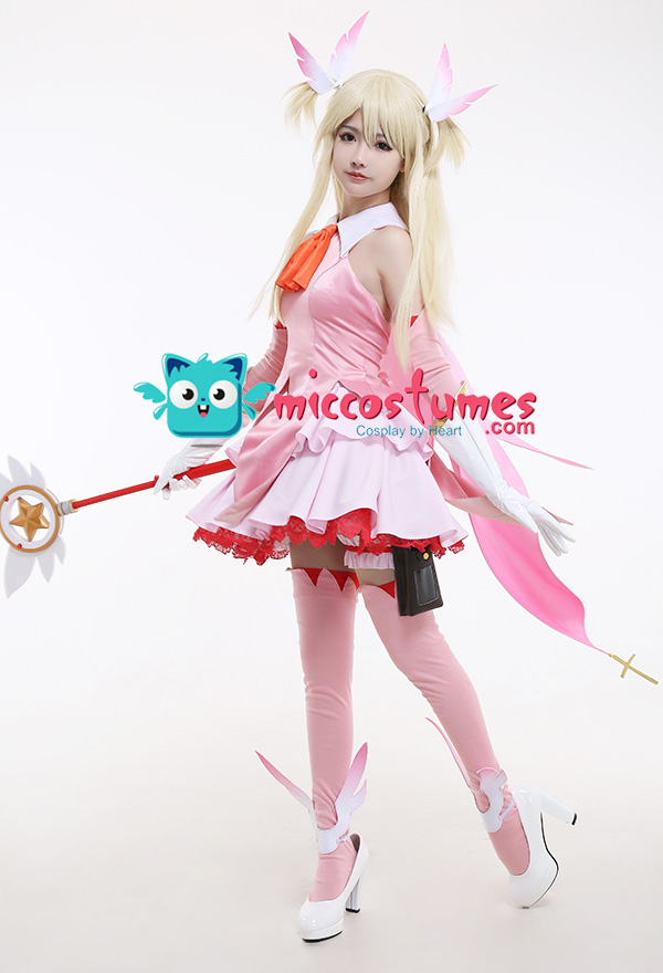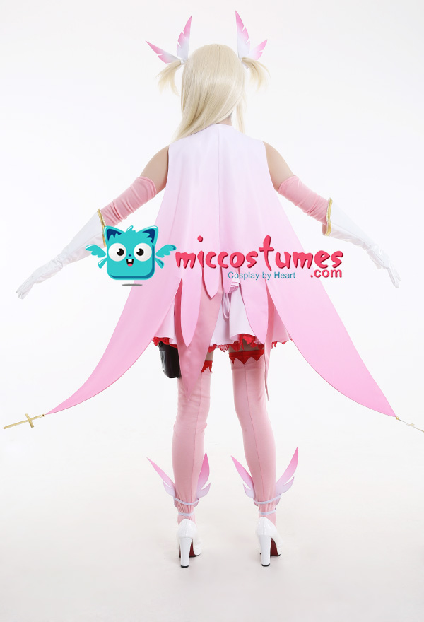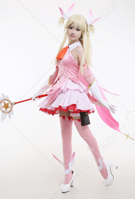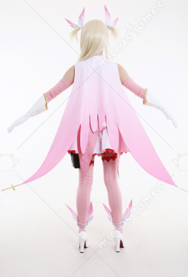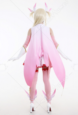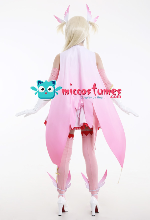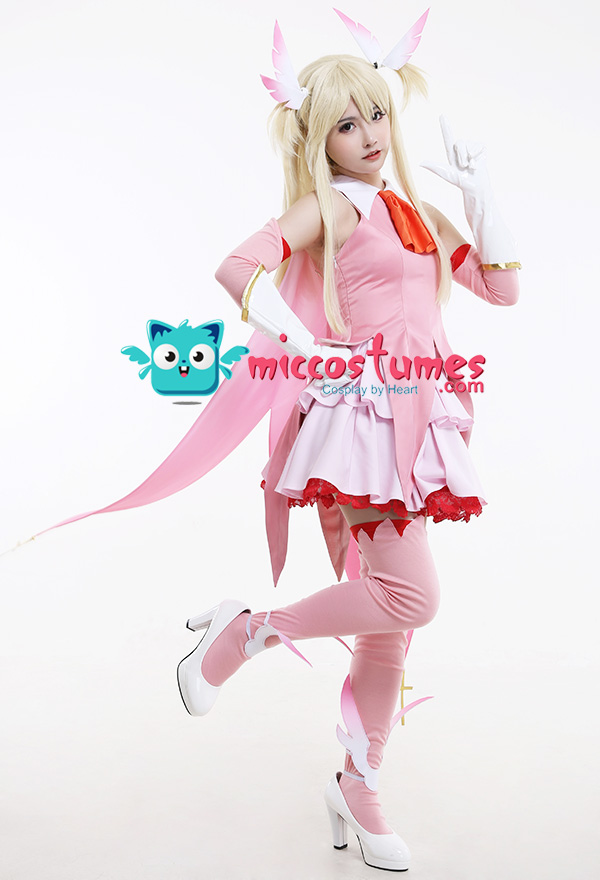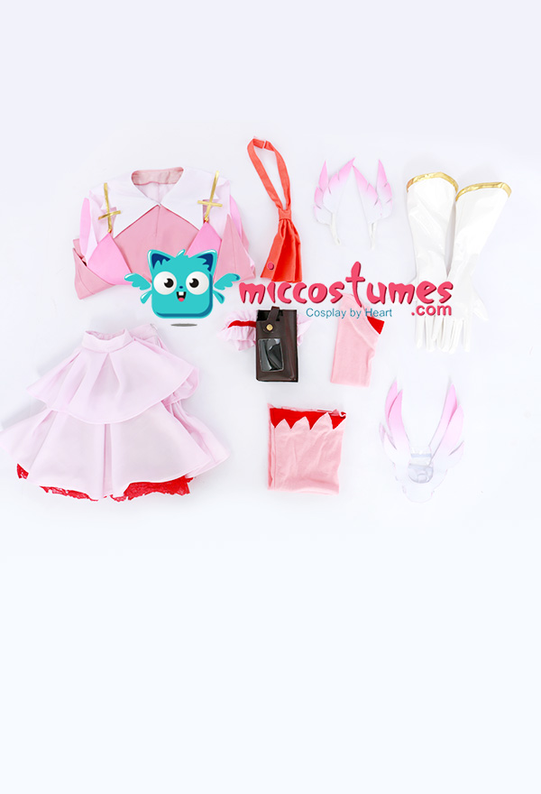 Costume Includes: top, skirt, glove*2, sleeves*2, tie*1, hair accessory*2, shoes accessory*2, thigh band*1, thigh bag*1, stocking*2. Materials: uniform cloth, knitted fabric, PU leather, spandex, satin, cotton, lining, polyester, PVC, EVA, aluminum wire. Design Details: The tie can be detached to match with other costumes. The back of the costume top is lace-up, so the size can be adjusted. Aluminum wires are used in the hair accessories, which helps to restyle as you need. Digital printing process is used for the costume to make sure the colors change gradually and naturally.